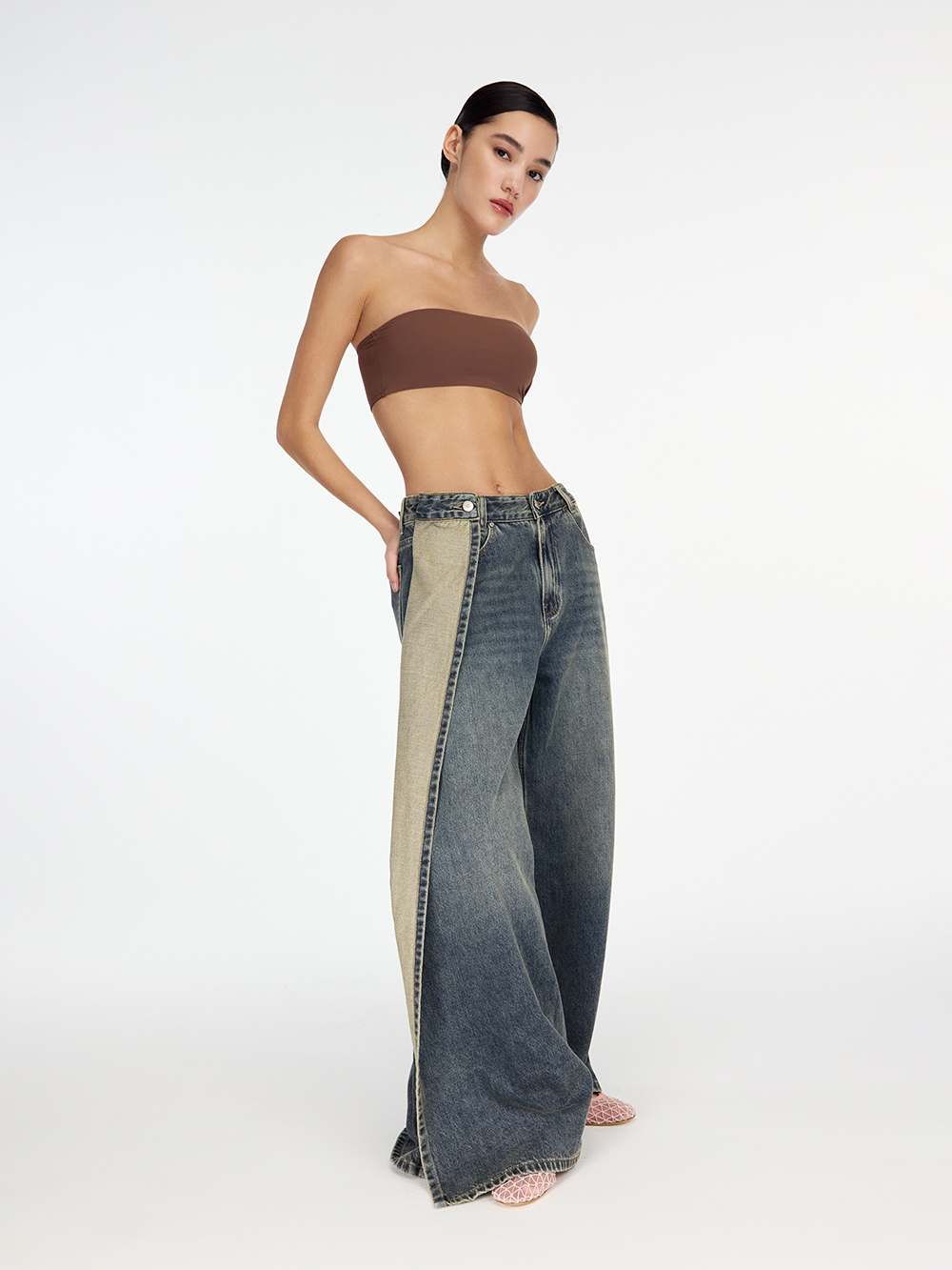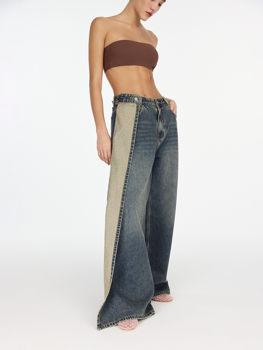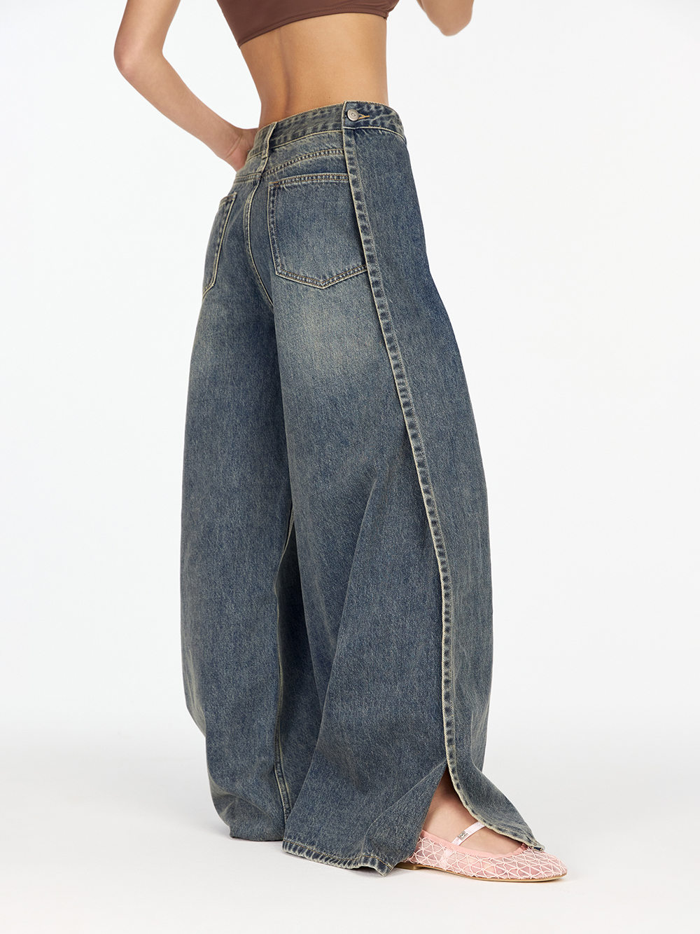 Джинсы на запах с разрезом
