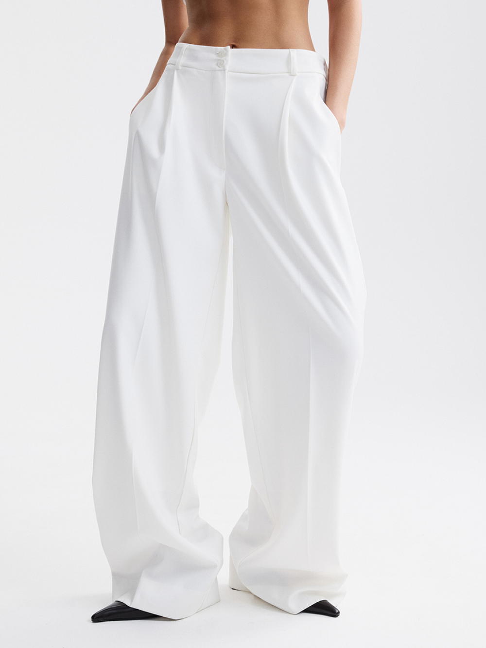 Брюки-палаццо – идеальный вариант для создания элегантных образов. Брюки выполнены из костюмной ткани высокого качества на основе вискозы, комфортной, пластичной и не слишком мнущейся. Модель с заложенными складками, которые мягко расширяют брюки книзу, визуально удлиняют силуэт. Чтобы светлая ткань не просвечивалась, мы предусмотрели подкладку с шёлком в составе. Чтобы посадка была совершенной, сзади на поясе есть резинка. Есть карманы. Брюки застёгиваются на пуговицы и молнию, есть шлёвки для ремня.