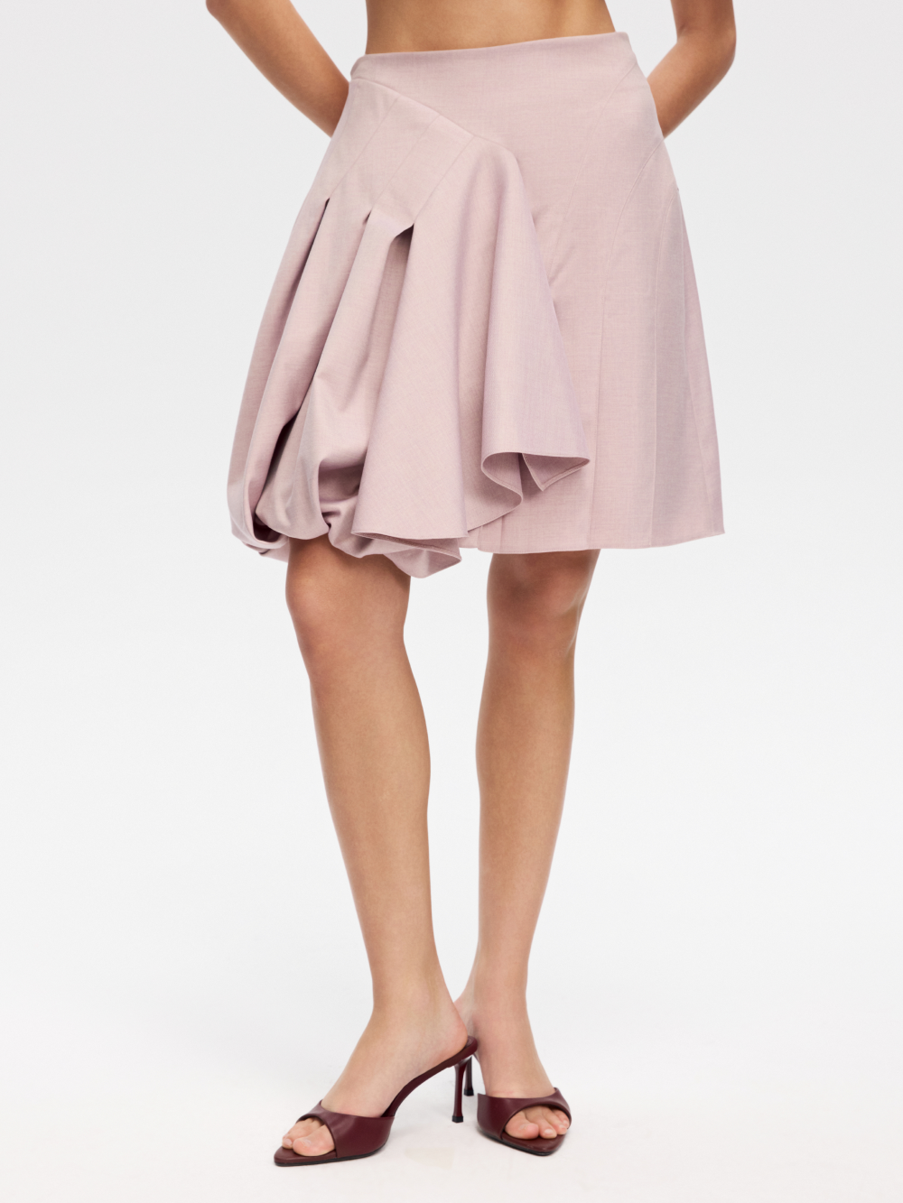 Юбка, похожая на бутон, станет акцентной вещью в гардеробе. Юбка отличается красивой формой и сложносочинённым кроем со сборкой и складками. Юбка выполнена из костюмной ткани и дополнена подкладкой с шёлком в составе. Застёгивается на молнию сзади. Юбку можно стилизовать сольно или составить идеальный дуэт с жакетом с вышивкой из коллекции TRUE RED.