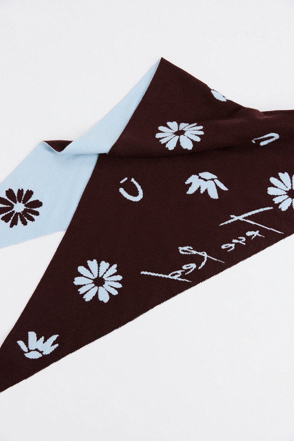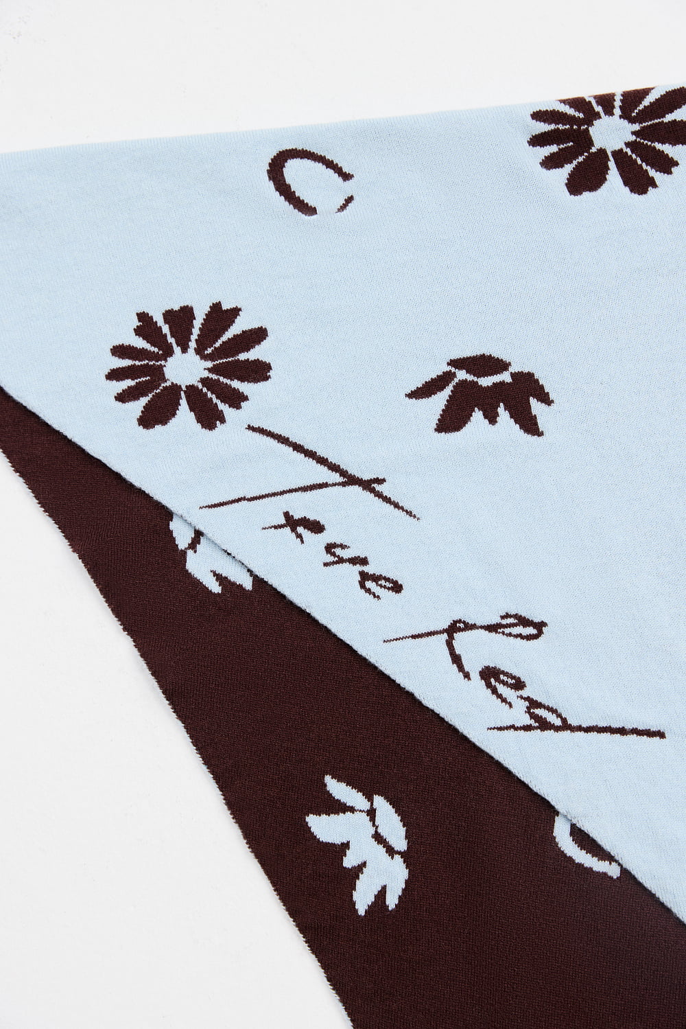 Косынка связана из мягкой и тёплой пряжи с шерстью, кашемиром и нежной вискозой. Косынка двухсторонняя, с вязаным цветочным принтом и логотипом бренда. Включите косынку в свой образ: повяжите на голову, накиньте как согревающий шарф или акцентный аксессуар со свитером, пальто или пуховиком.