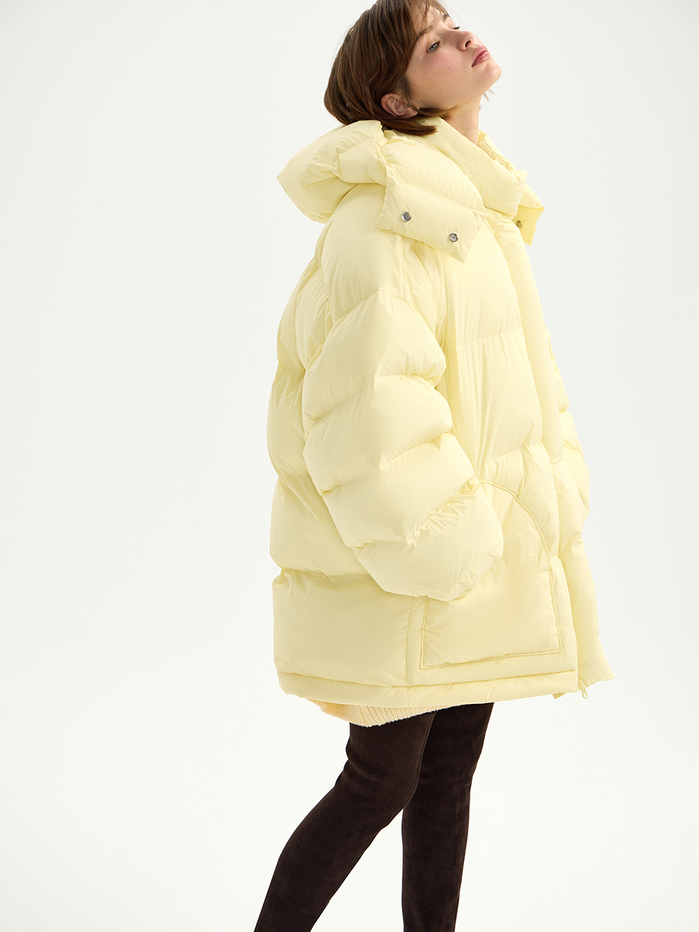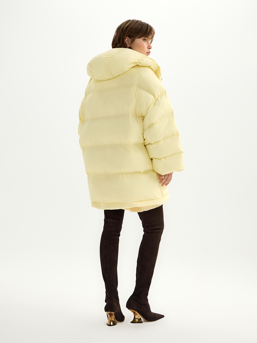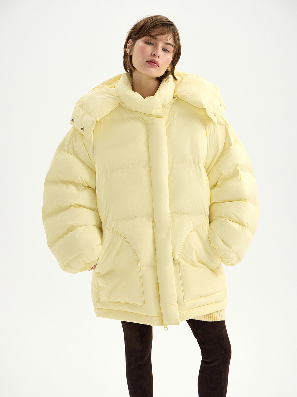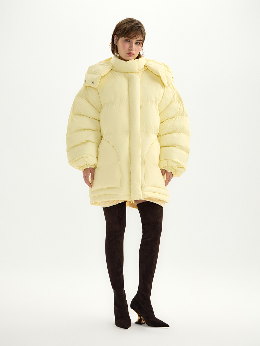 Объёмный пуховик с капюшоном – очень тёплый, уютный и комфортный. Актуальный О-силуэт: стильная дутая форма со “стекающими” плечами и объёмными рукавами. Пуховик выполнен из ткани с водоотталкивающей пропиткой, которой не страшны дождь и снег. Особенность модели – удобный портплед для хранения и перевозки, вшитый внутри пуховика.