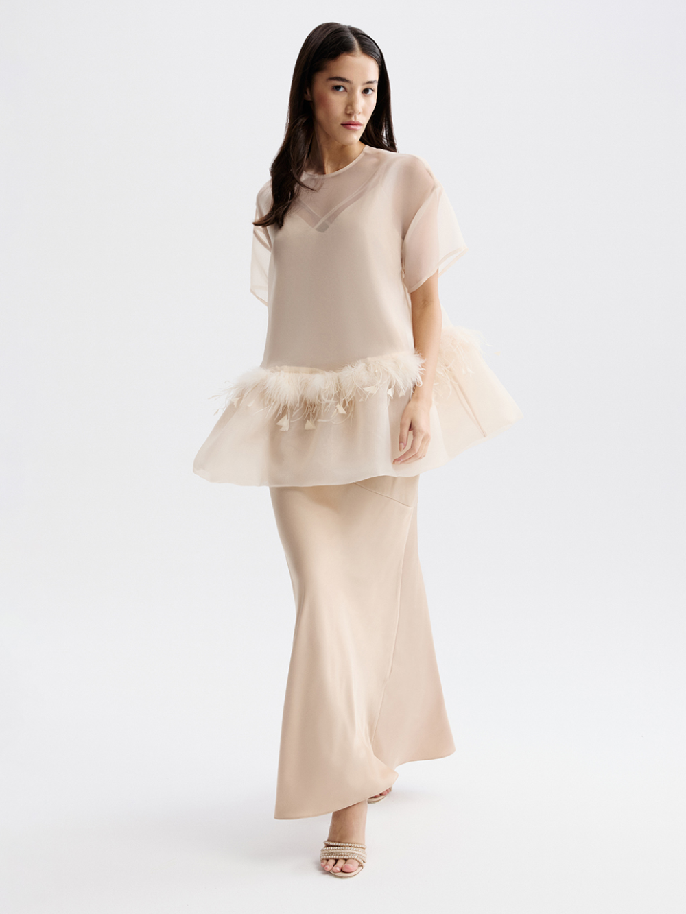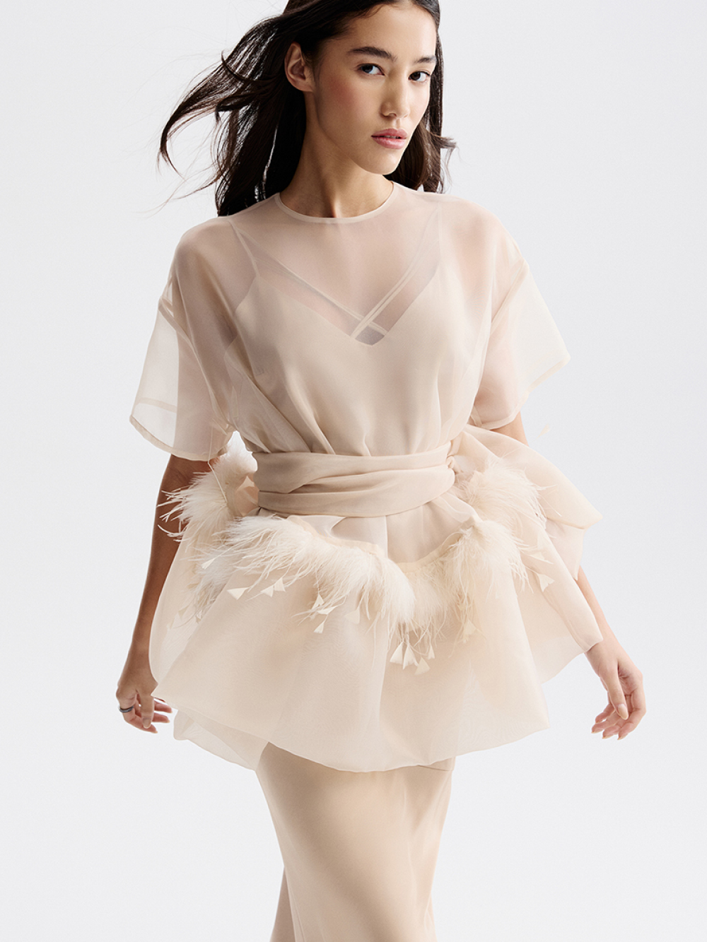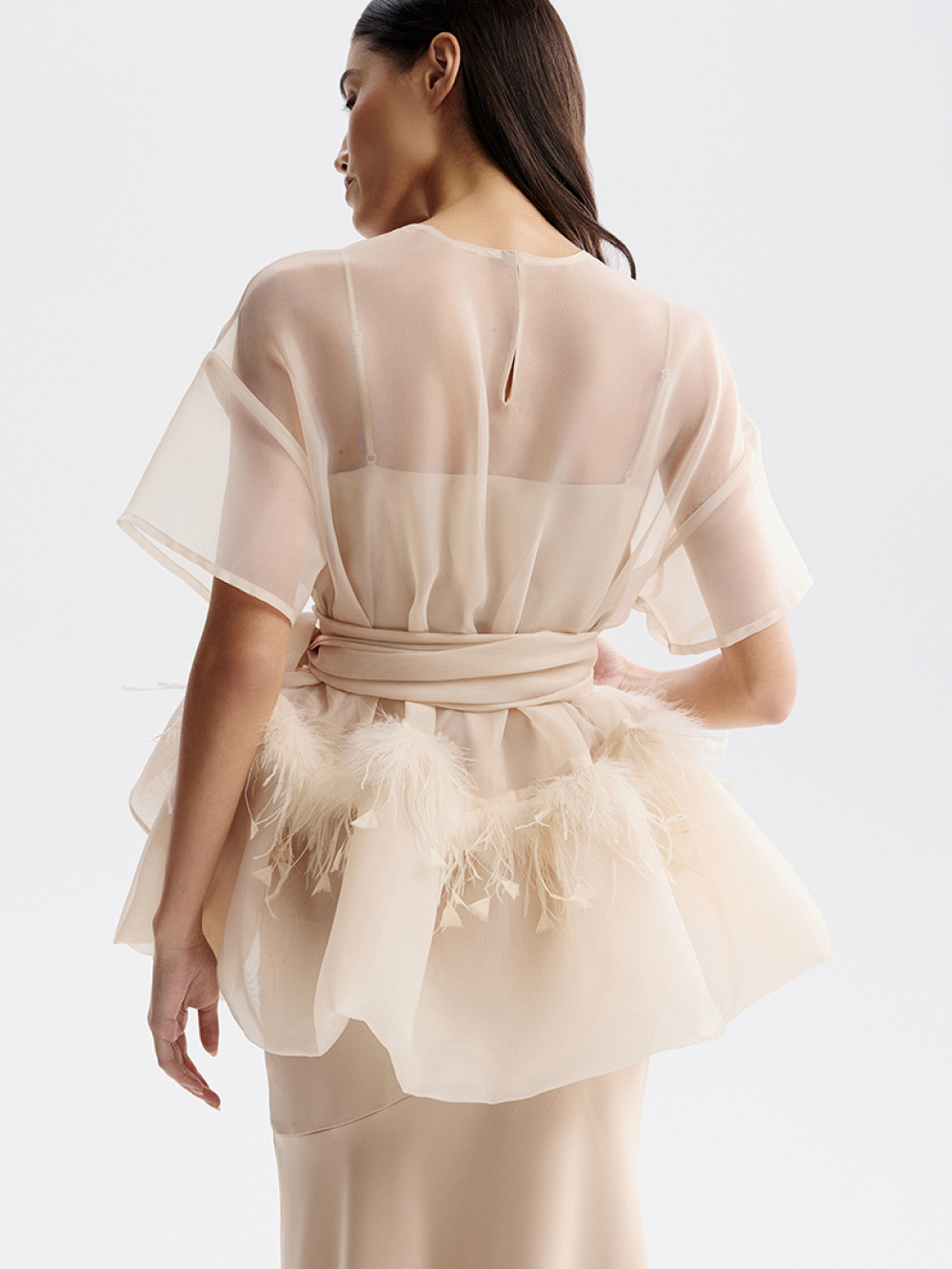 Топ с декором из перьев, идеальный для создания вечерних образов, выполнен из матовой органзы, великолепной в драпировке. Топ застёгивается на пуговицу на спине. В комплект входит широкий пояс-лента из основной ткани. Подчеркните талию, создав хрупкий образ в стиле балеткор, или оставьте топ свободным и воздушным. Предлагаем сочетать модель с топами в бельевом стиле из коллекции TRUE RED.