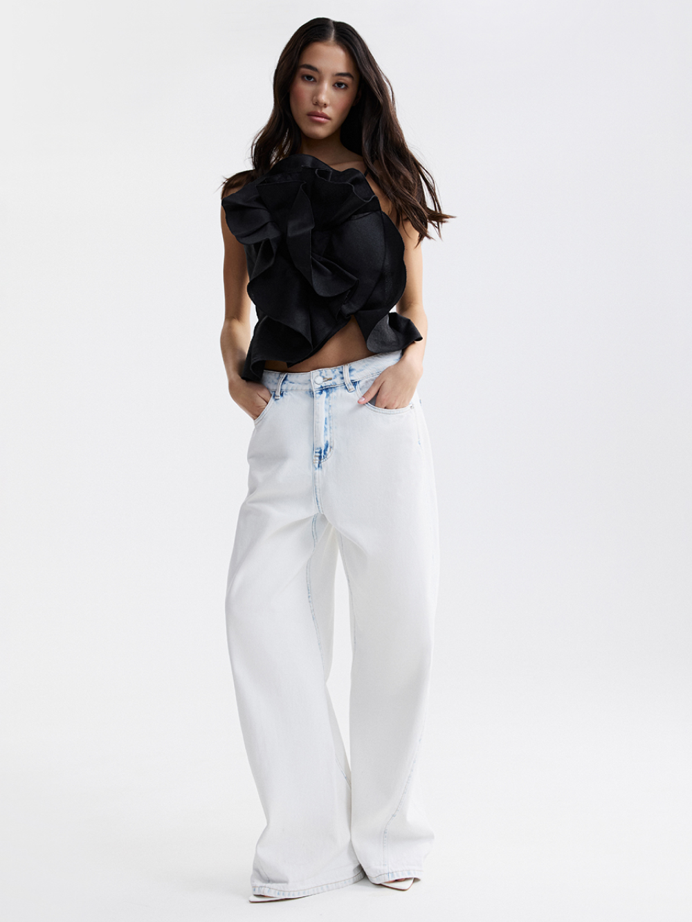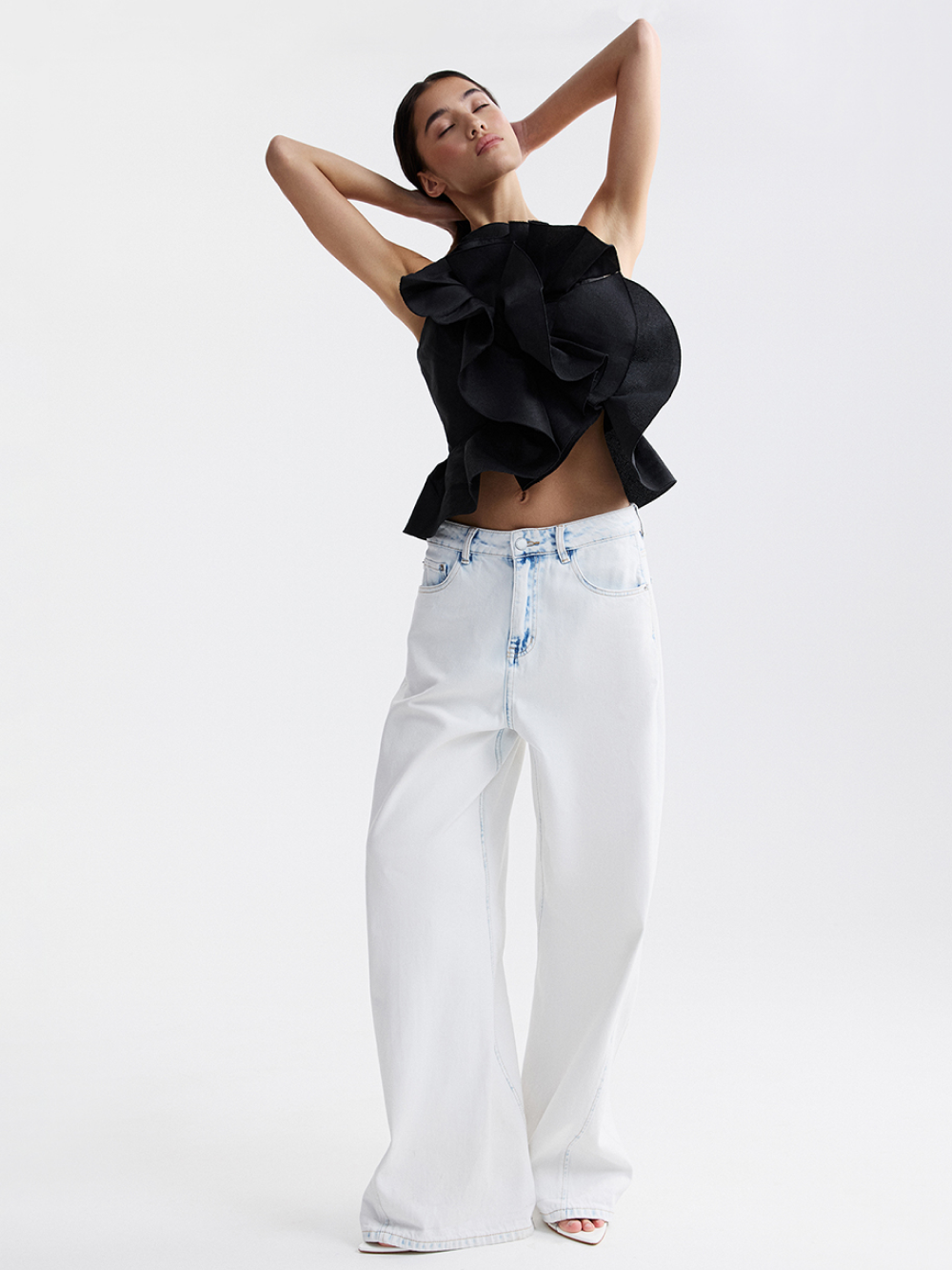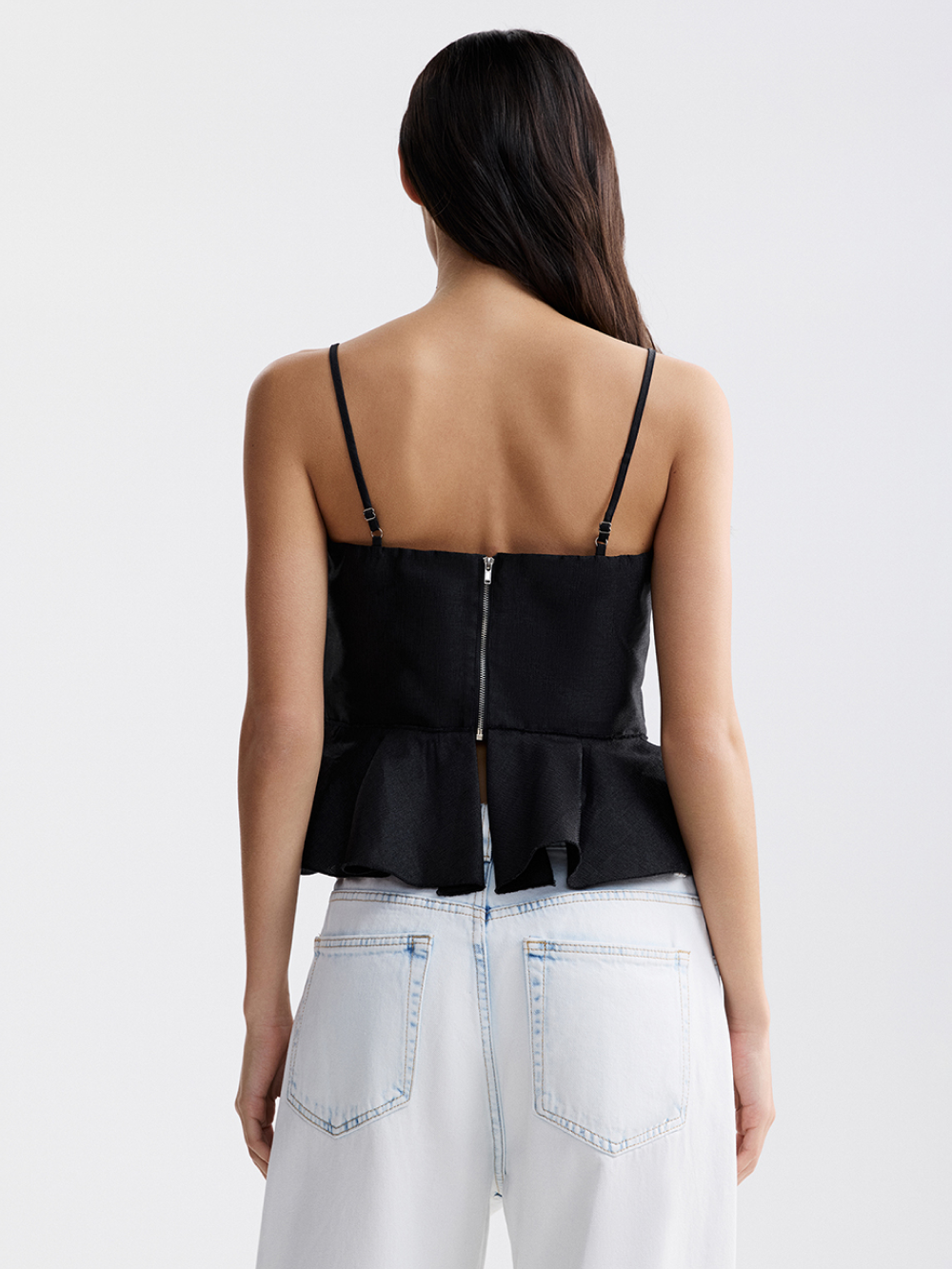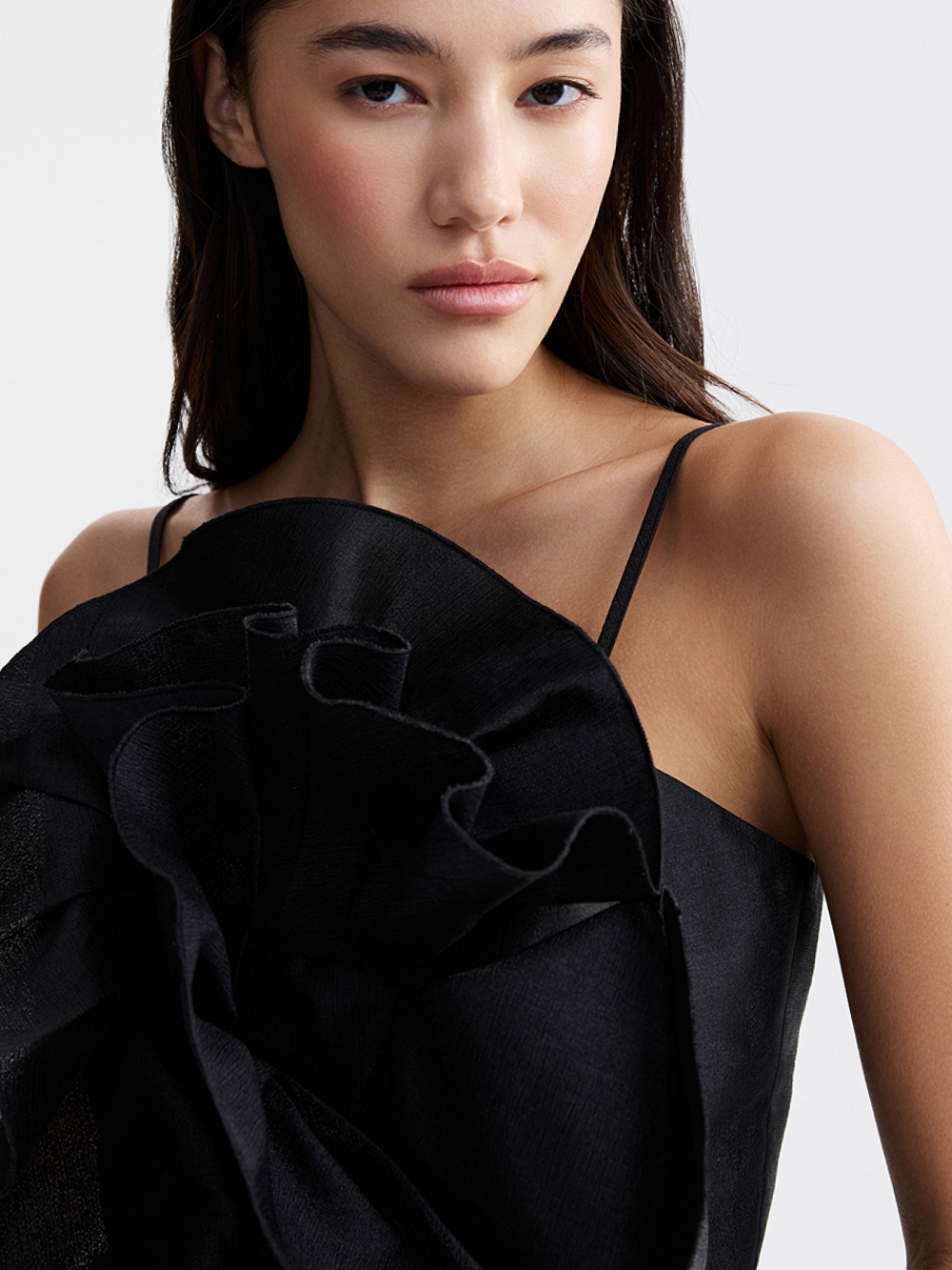 Изящный топ из тафты украшен фигурным рюшем, подобным цветку. Тафта с красивой текстурой достаточно плотная, чтобы хорошо сохранять форму. Топ полуприлегающего силуэта, благодаря рельефам формируется точная посадка, а для лучшей фиксации мы предусмотрели силиконовую вставку по внутреннему краю лифа. Бретели регулируются по длине. Топ застёгивается на молнию на спинке.
