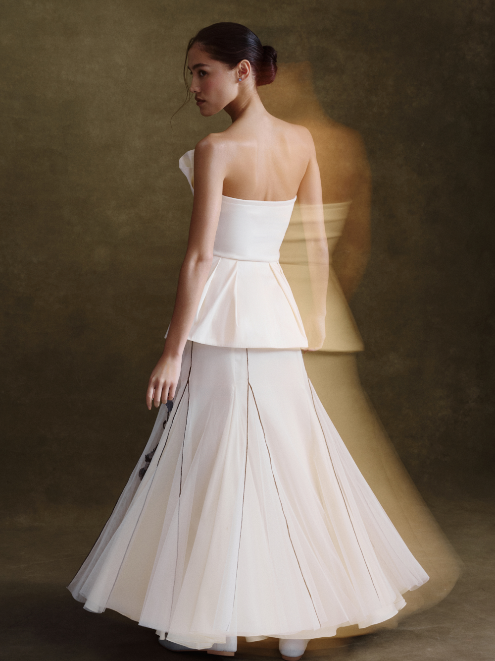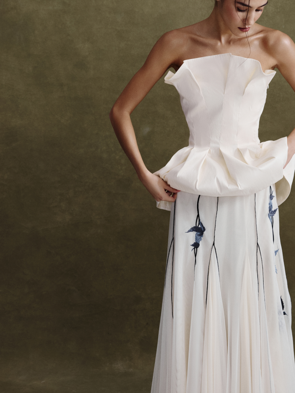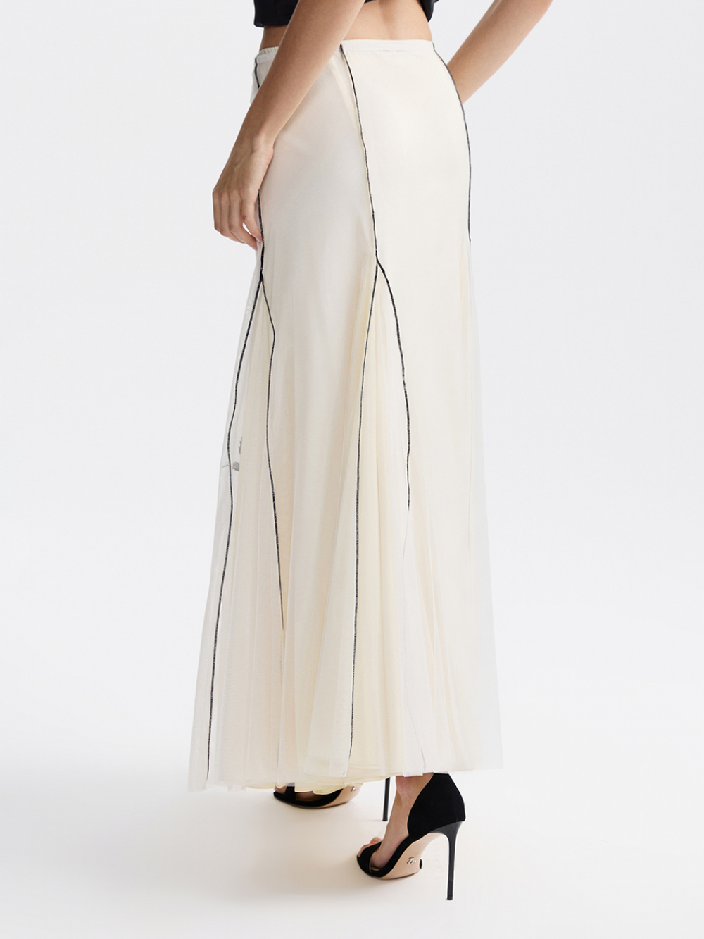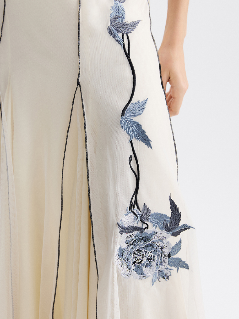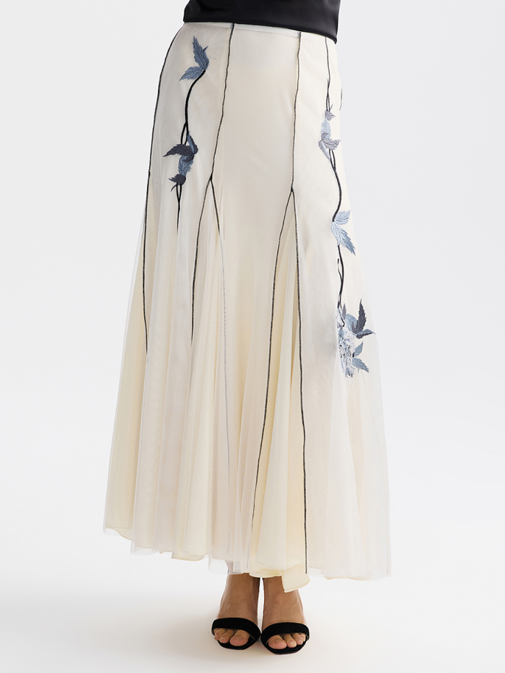 Юбка миди с вышивкой создана специально для лимитированной вечерней коллекции. Юбка-трапеция состоит из двух отдельных элементов: верхней сетки и нижней струящейся юбки.