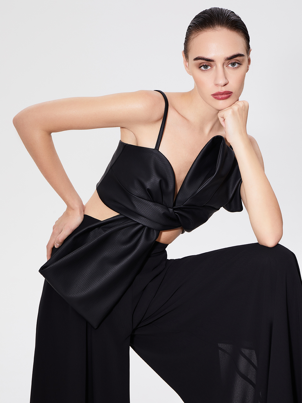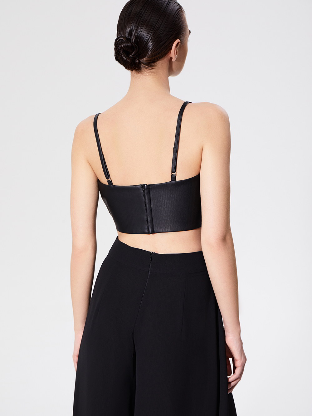 Кроп-топ выполнен из искусственной кожи с интересной фактурой. Мы выбрали плотный, но мягкий и приятный по ощущениям материал, по виду и тактильно повторяющий натуральную кожу. Топ станет эффектным акцентом образа в дуэте с сорочкой или кружевным топом. Без подкладки. Топ застёгивается на крючки сзади. Бретели зафиксированы.
