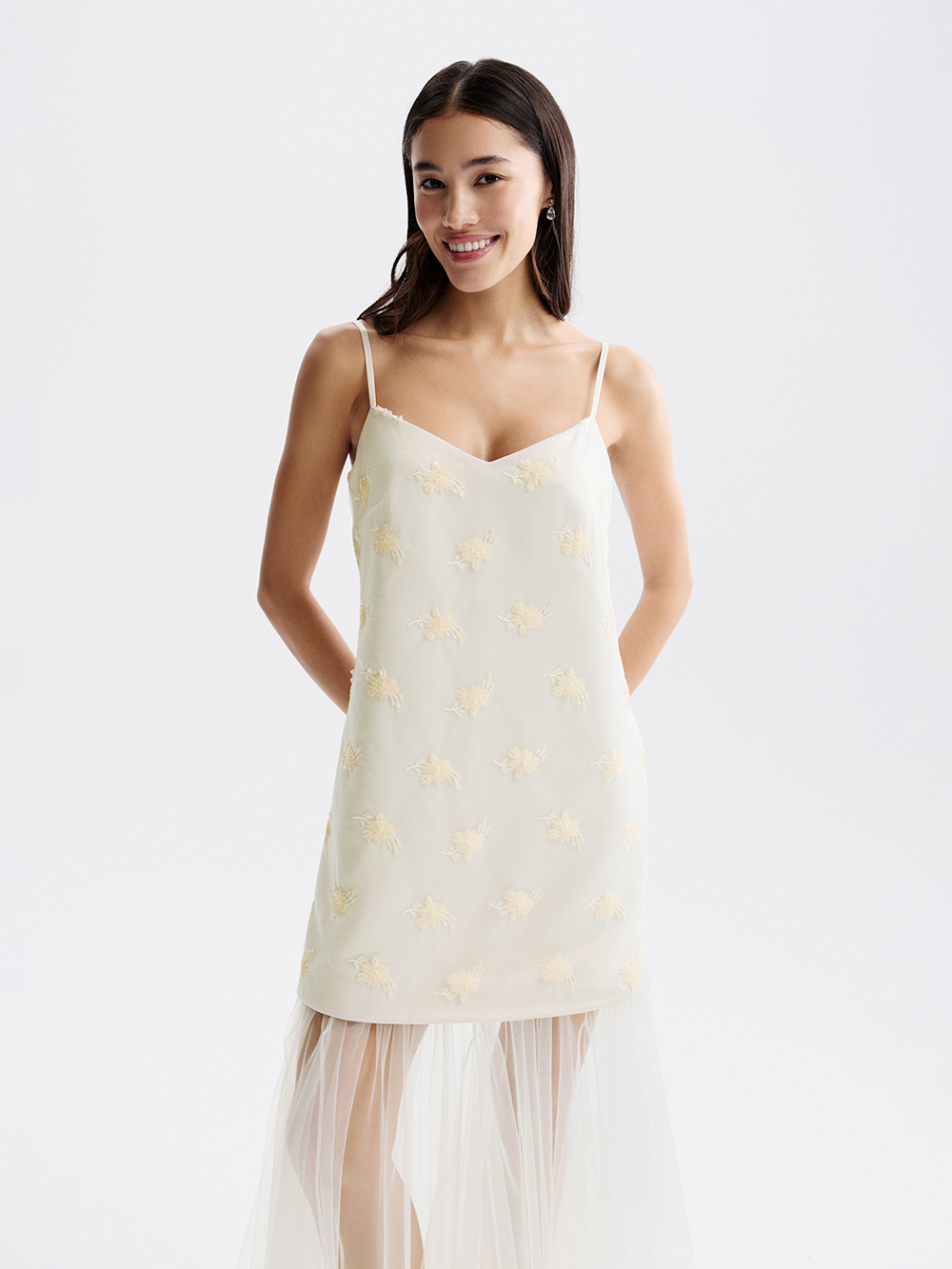 Платье в пол создано специально для лимитированного дропа. Вышивка пайетками, полуприлегающий силуэт сатинового футляра и пышная юбка из мягкой сетки, выполненная клиньями – поддерживают вечернюю стилистику платья. Ткань-сетка создана по индивидуальным эскизам дизайнеров бренда: от рисунка до подбора пайеток и расшивки, выполненной по нашему заказу. Платье дополнено подкладкой с шёлком в составе. Бретели можно регулировать по длине. Платье застёгивается на молнию сзади.