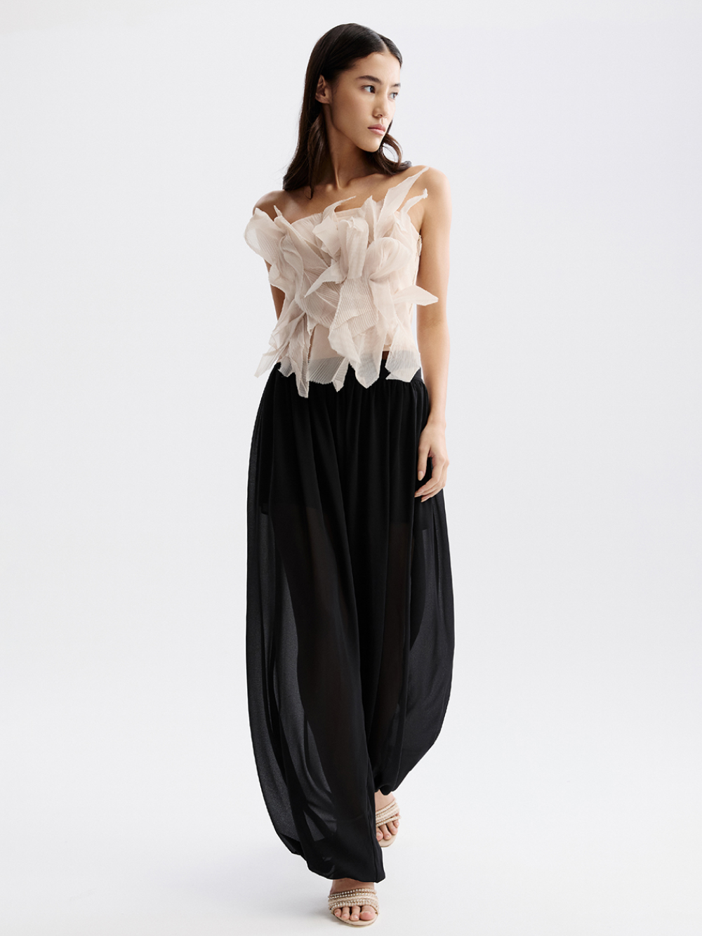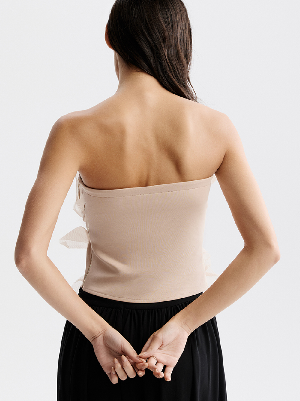 Топ-бандо украшен декором из органзы гофре, подобной воздушным лепесткам. Топ выполнен из плотного трикотажа на основе комфортного хлопка. Пластичная ткань формирует точную посадку, а для лучшей фиксации топа мы предусмотрели силиконовую вставку по внутреннему краю лифа. Застёгивается на молнию сбоку.