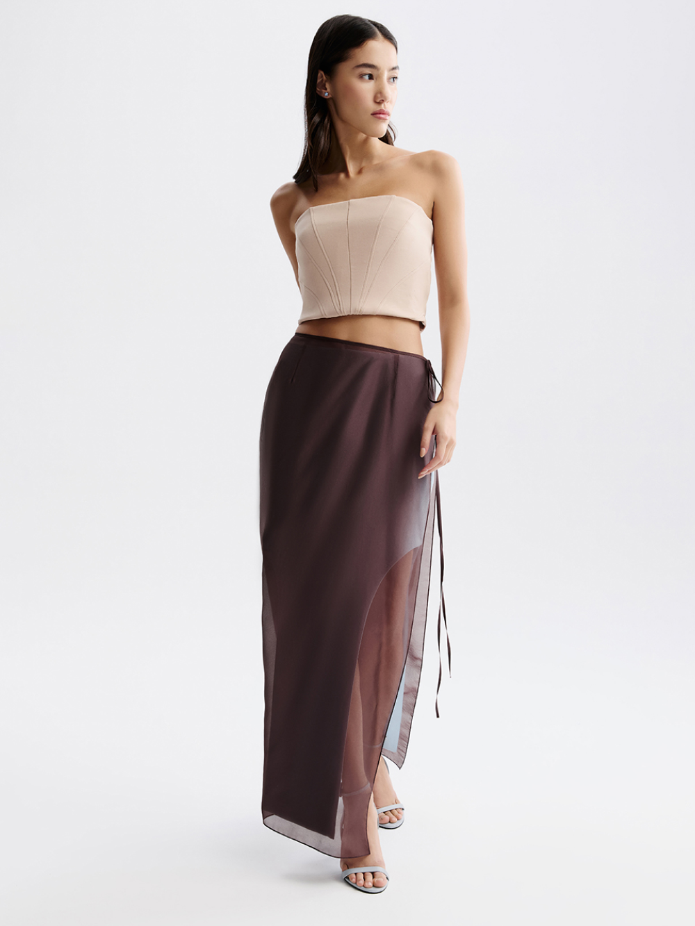 При создании нижней юбки мы использовали приём деконструкции, выполнив высокие вырезы, красиво открывающие ноги. Юбка сшита из костюмной ткани с подкладкой на основе шёлка. Застёгивается на молнию сбоку.