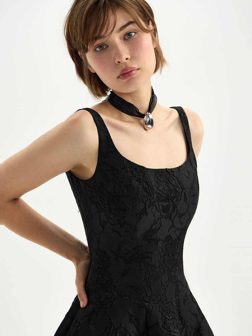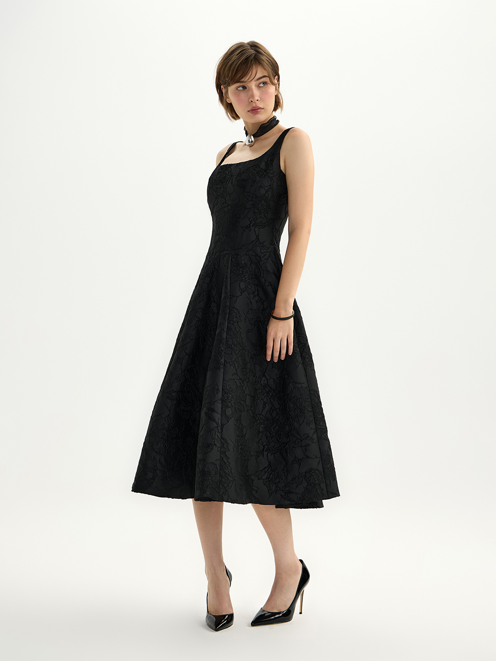 Платье из тафты с фактурным цветочным орнаментом создано для особенных событий. Корсетный лиф с рельефами и пышная юбка подчёркивают талию и формируют женственный силуэт. Декоративная плотная ткань, созданная специально для нарядных изделий, красиво держит форму. Платье дополнено приятной тактильно подкладкой с шёлком в составе. Есть карманы. Платье застёгивается на молнию сзади.
