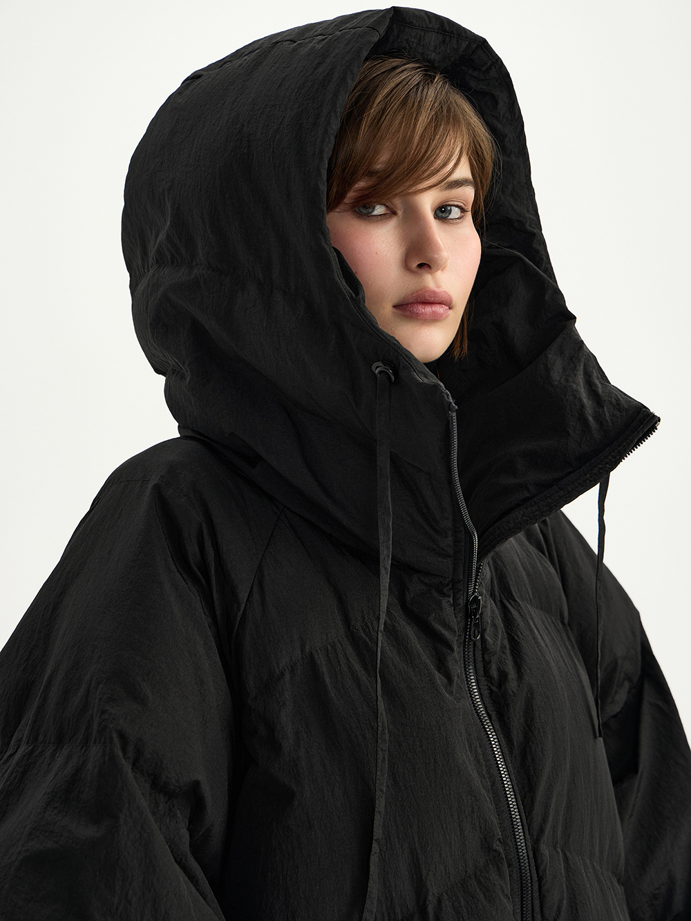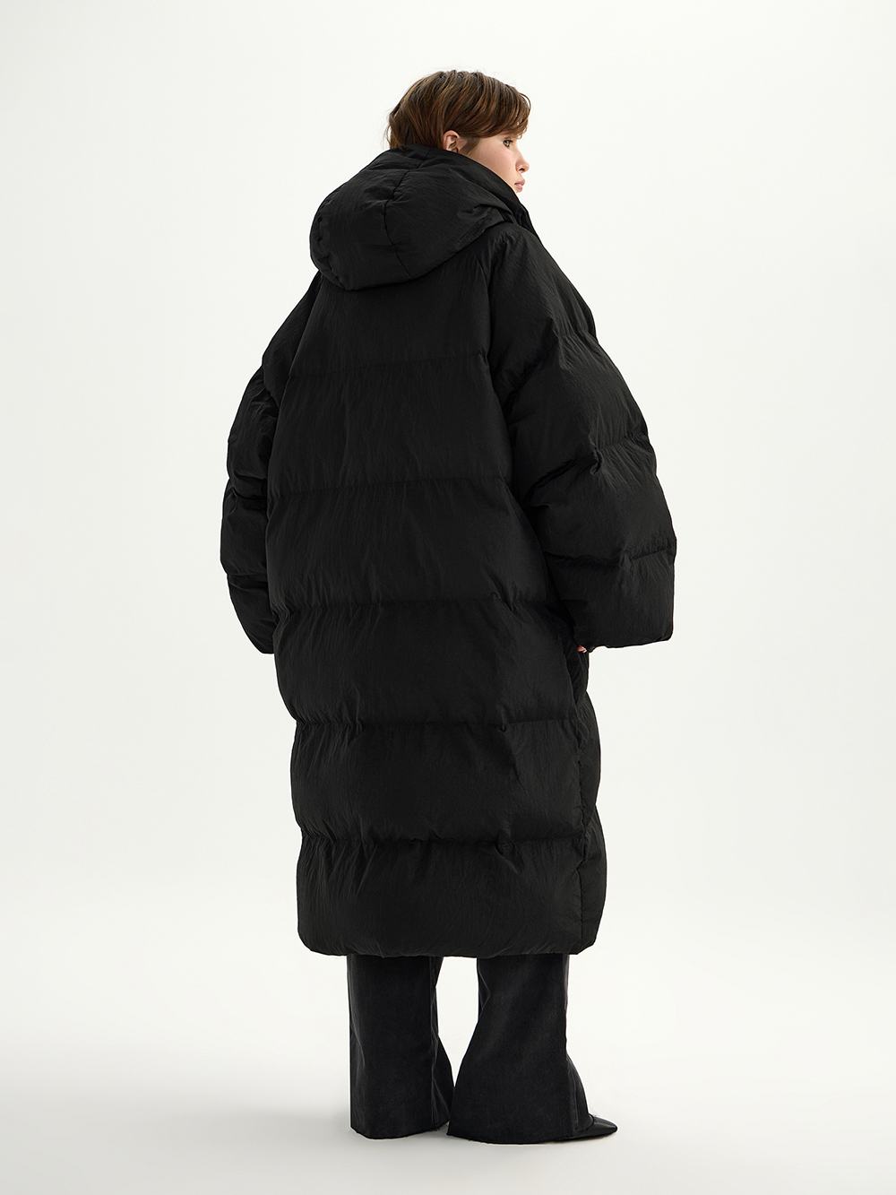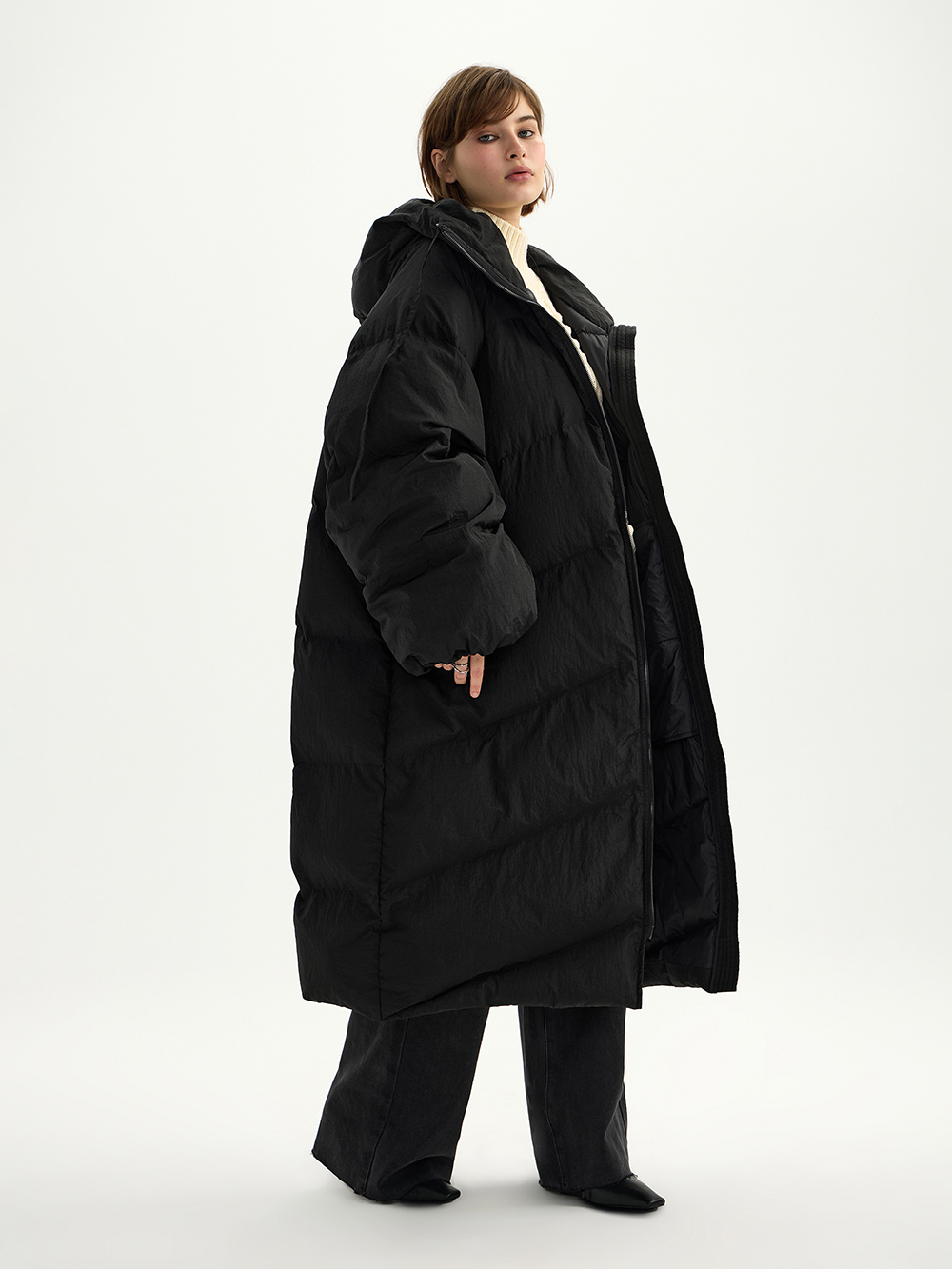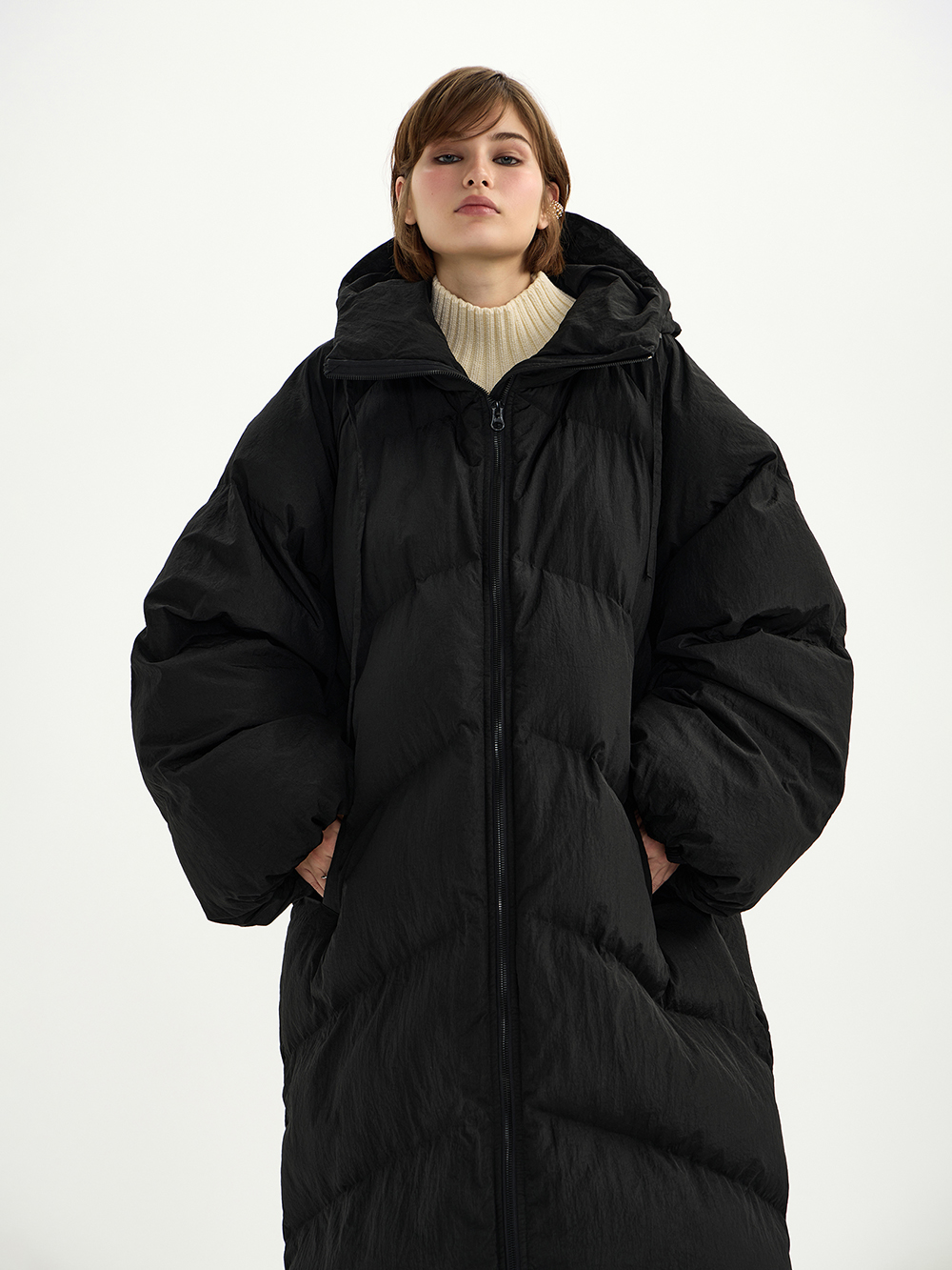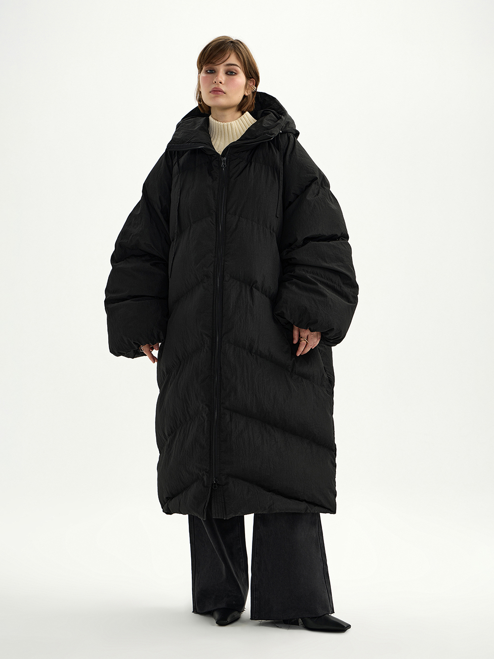 Длинный, очень тёплый пуховик-пальто с капюшоном – комфортный и мягкий, как одеяло. Стильная продуманная форма: актуально объёмная и свободная, чтобы надеть вниз свитер, при этом пуховик аккуратно сидит в плечах и визуально не увеличивает. Пуховик выполнен из ткани с водоотталкивающей пропиткой, которой не страшны дождь и снег. Высокий воротник со стойкой, переходящий в удобный капюшон с кулиской, надёжно защитит от холодного ветра. Пуховик застёгивается на двухстороннюю молнию. Есть карманы.