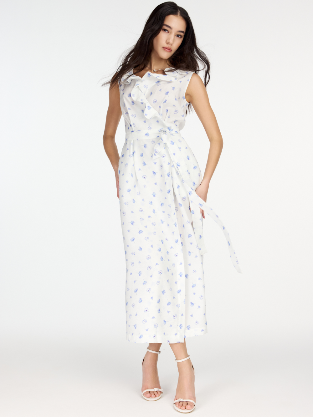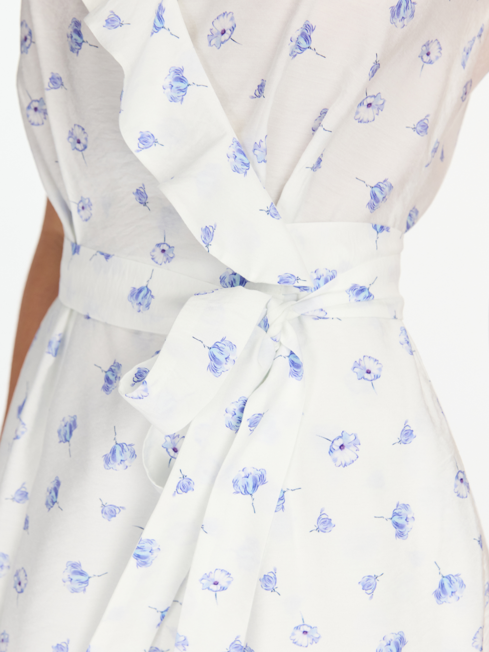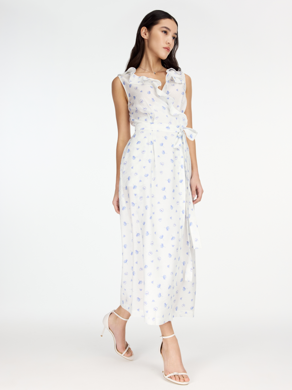 Платье на запах с V-образным вырезом, украшенным воланом – готовый женственный образ. У платья полуприлегающий силуэт и универсальная длина миди. Платье очень комфортное для лета: сшито из нежной вискозной ткани и дополнено мягкой подкладкой из тонкого хлопка. Запах надёжно фиксируется поясом из основной ткани. Есть карманы.
