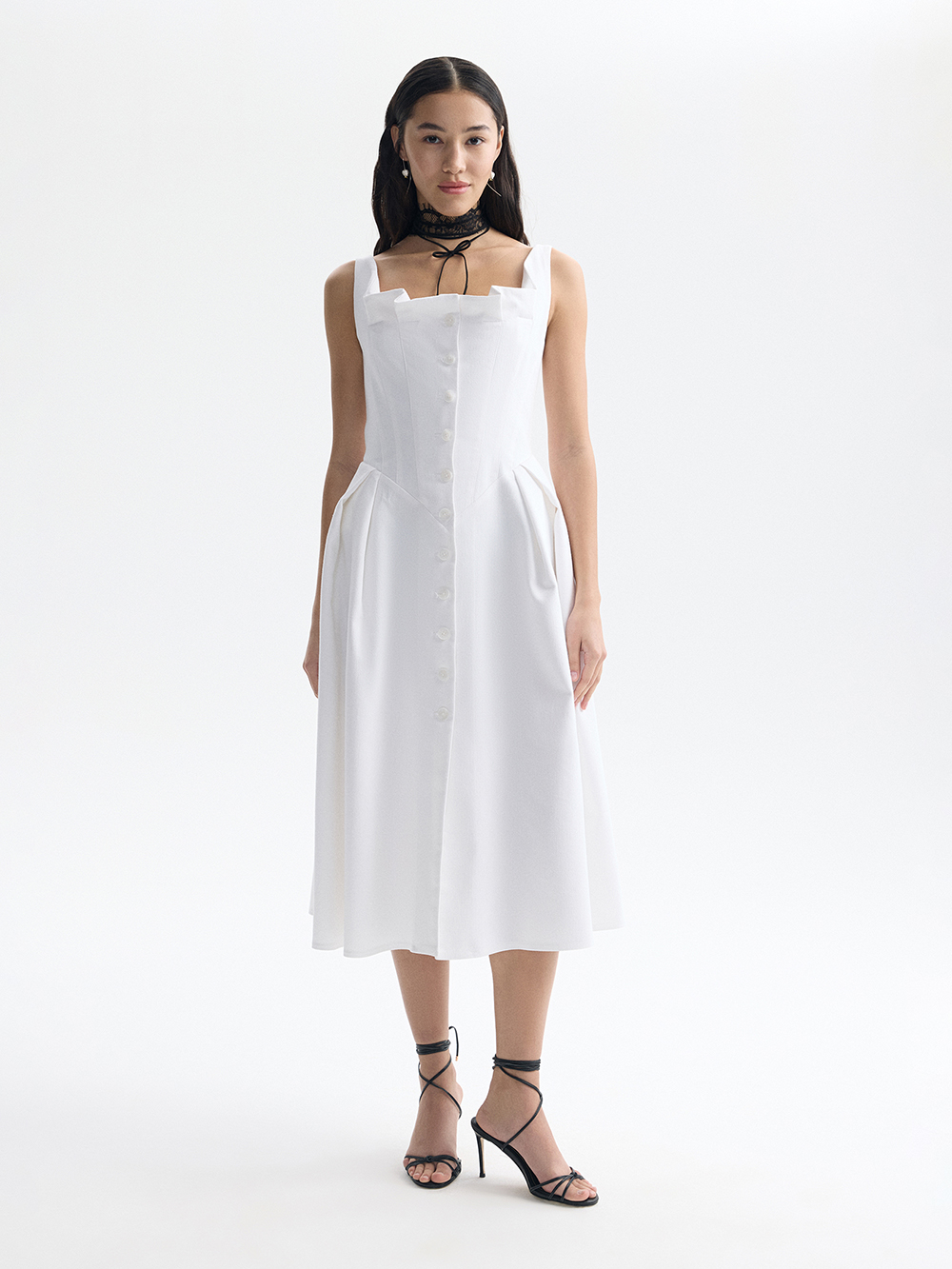 Платье миди для создания хрупкого женственного образа. Корсетный лиф и пышная юбка формируют очерченный силуэт и подчёркивают тонкость талии. Красивую форму юбки помогают поддерживать глубокие складки и настоящий кринолин, предусмотренный нашими дизайнерами. Платье выполнено из плотной ткани на основе хлопка и дополнено мягкой хлопковой подкладкой. Застегивается на пуговицы.