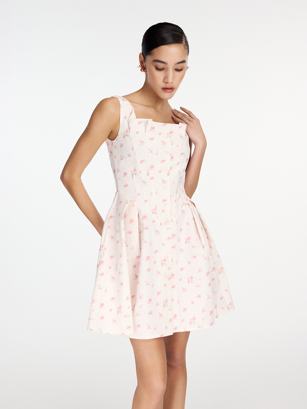 Платье мини для создания хрупкого, женственного образа. Корсетный лиф и пышная юбка формируют выразительный силуэт, а внутренняя баска помогает юбке красиво держать форму и создаёт дополнительный объём. Модель выполнена из плотной ткани на основе хлопка и дополнена мягкой хлопковой подкладкой для комфортной посадки. Застёгивается на пуговицы.