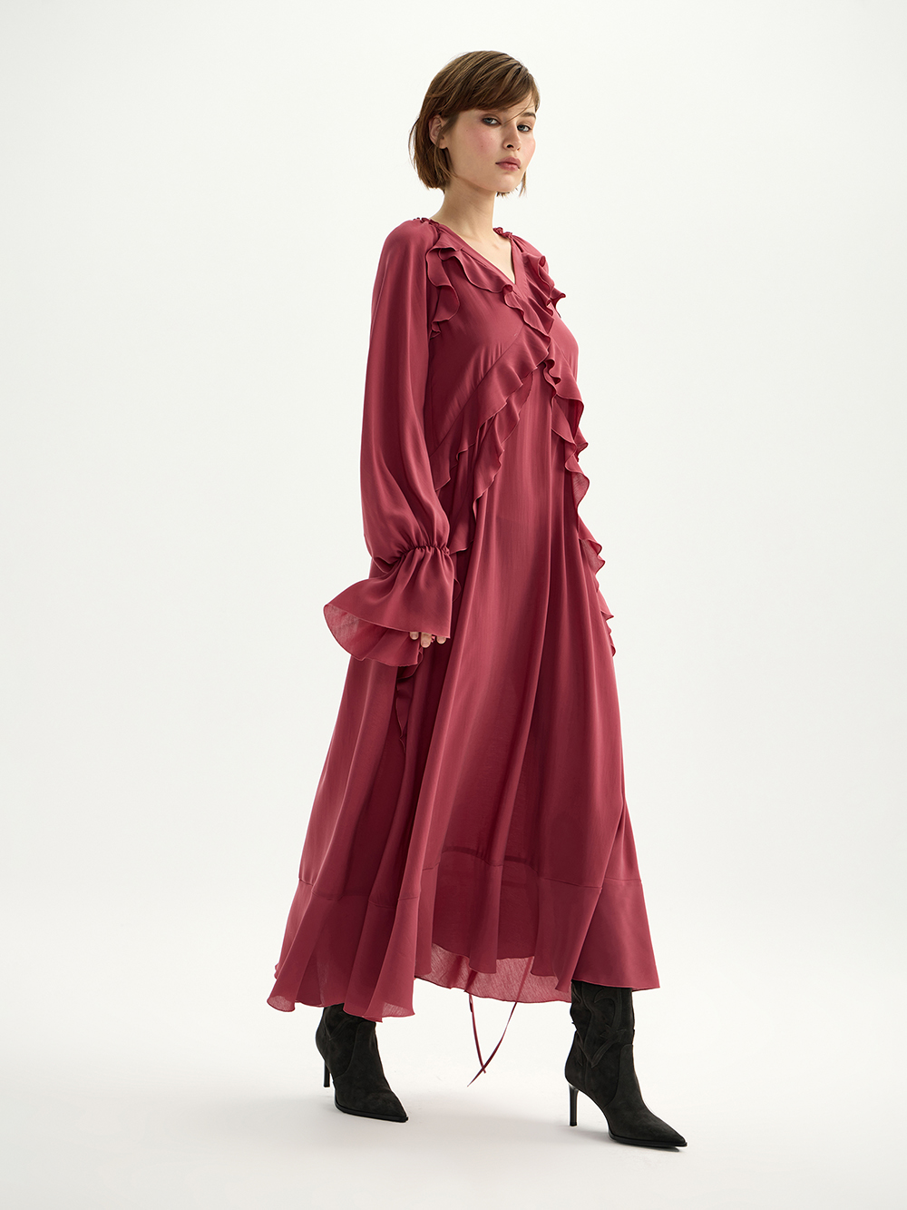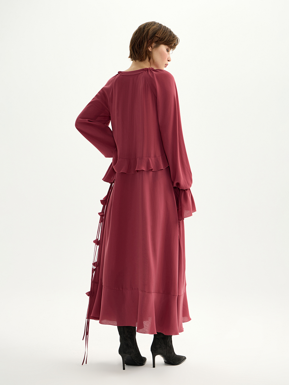 Платье макси, расшитое оборками и воланами, выполнено в актуальной эстетике бохо. Тонкий пояс-шнур с декором позволяет формировать силуэт: подчеркнуть талию или оставить платье свободно ниспадать. Платье сшито из тонкой, летящей ткани – нежной и дышащей, на основе натуральных волокон тенсела. Особое тактильное удовольствие от подкладки с шёлком в составе.