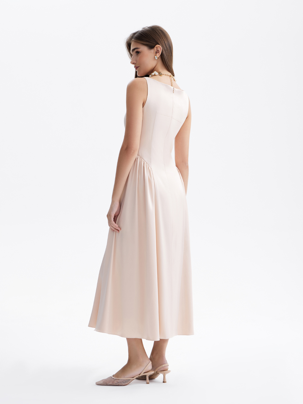 Платье с пышной юбкой из струящегося сатина создаёт хрупкий изящный образ. Корсетный верх с аккуратным прилеганием, подчёркнутая талия, вертикальные линии драпировки – всё в платье акцентирует внимание на женственном силуэте. Есть приятная к телу подкладка с шёлком в составе. Платье застёгивается на молнию сзади.