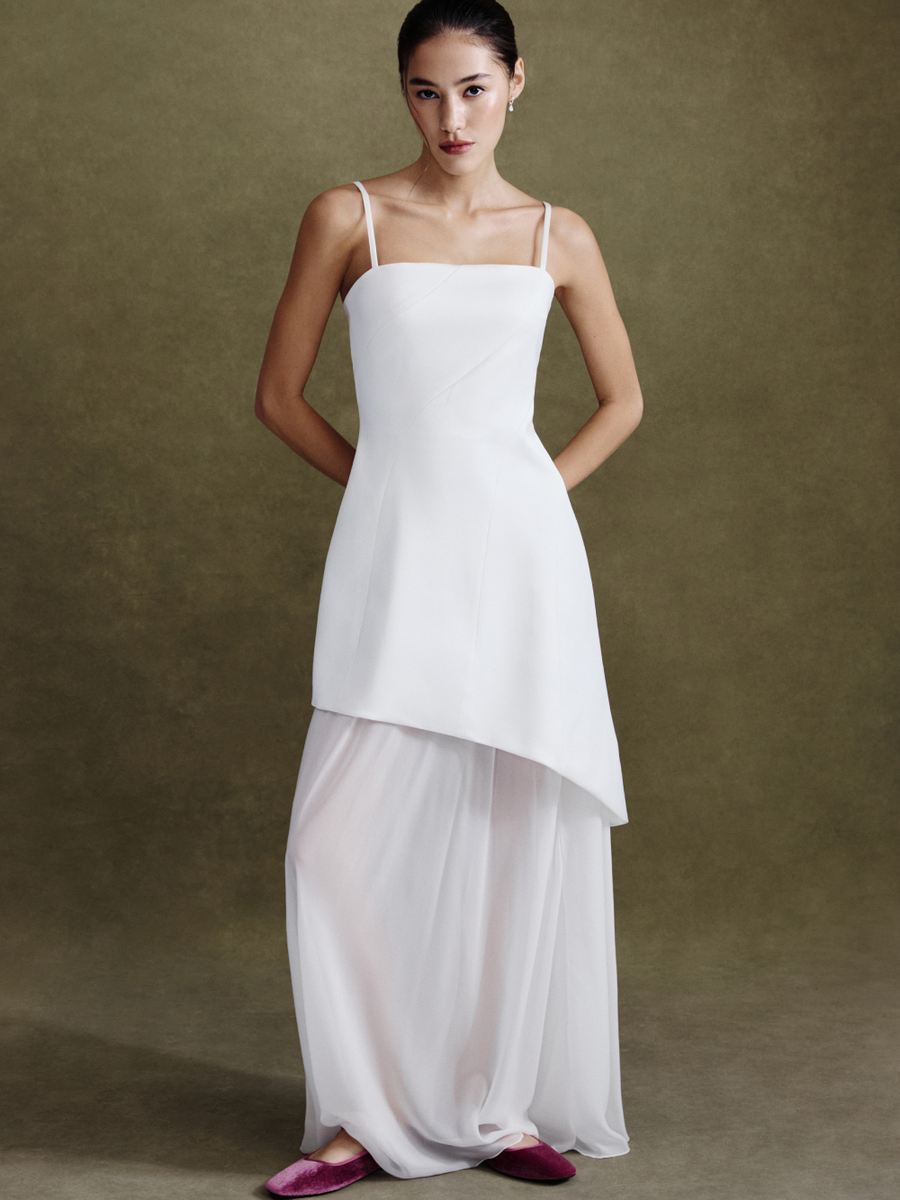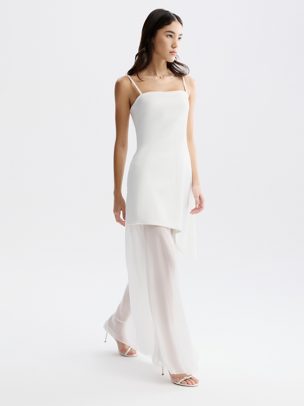 Вечернее платье с изящной асимметрией вошло в лимитированную коллекцию. Платье состоит из двух отдельных элементов: верхнего футляра и нижней юбки из шифона.