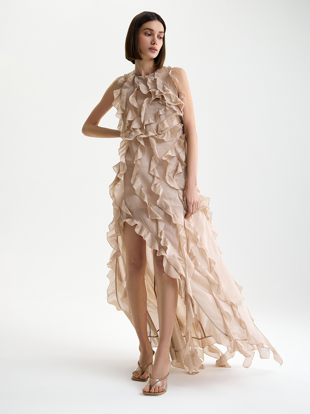 Платье, расшитое воланами, создано для заметных женственных образов. Магия платья в его универсальности: носите платье сольно или создайте актуальный дерзкий образ – стилизуйте с джинсами. Струящиеся воланы и продуманная асимметрия раскрывают красоту платья в динамике. Для платья мы выбрали нежнейшую, тонкую, дышащую ткань: натуральные волокна тенсела с добавлением нейлоновых нитей для упругости. Застёгивается на молнию сзади.