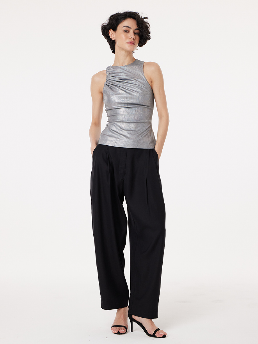 Топ без рукавов с драпировкой идеально подчёркивает фигуру. Для совершенства посадки и красивого облегания мы выбрали мягкую пластичную ткань, “текучую”, с лёгкой фактурой и эффектом металлик, и добавили приятную тактильно подкладку, которая хорошо тянется. Топ застёгивается на длинную молнию на спинке.