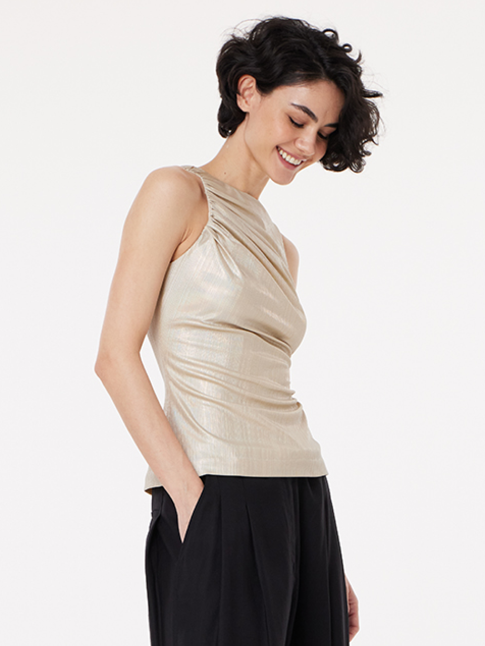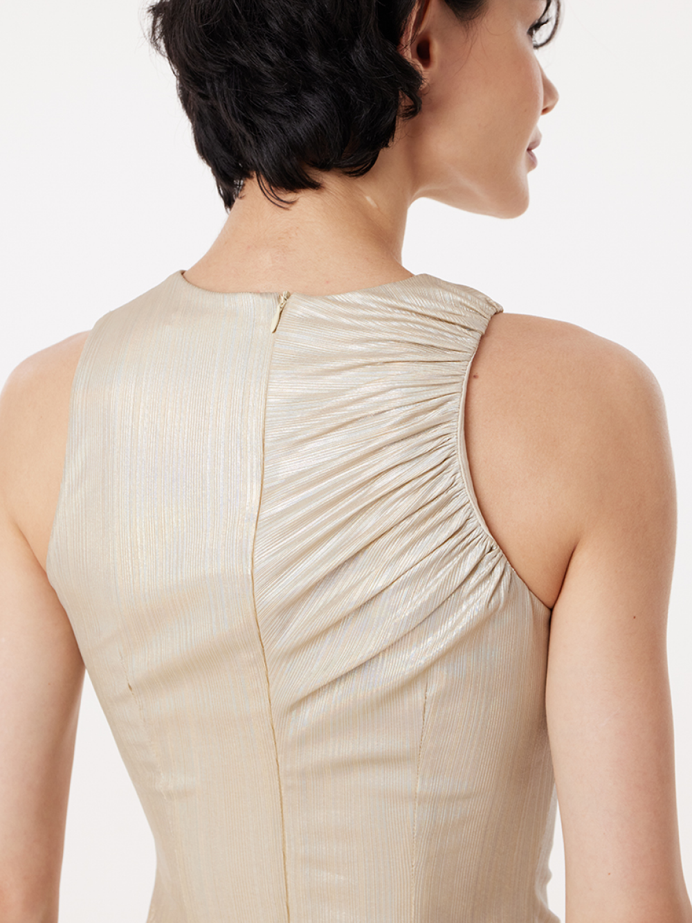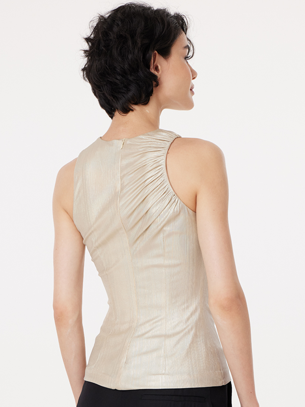 Топ без рукавов с драпировкой идеально подчёркивает фигуру. Для совершенства посадки и красивого облегания мы выбрали мягкую пластичную ткань, “текучую”, с лёгкой фактурой и эффектом металлик, и добавили приятную тактильно подкладку, которая хорошо тянется. Топ застёгивается на длинную молнию на спинке.