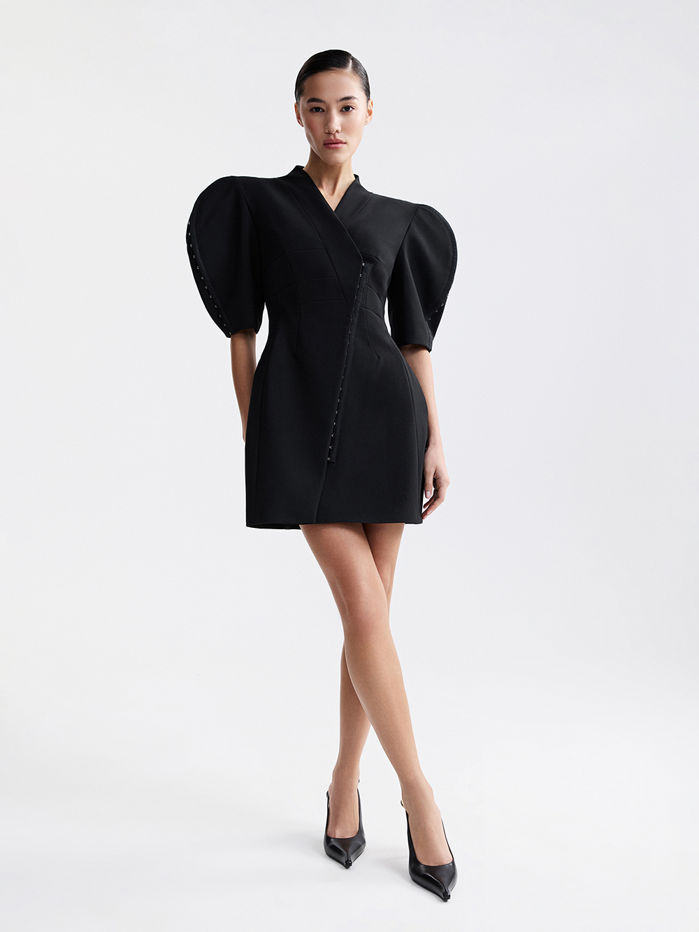 На модели платье размера S