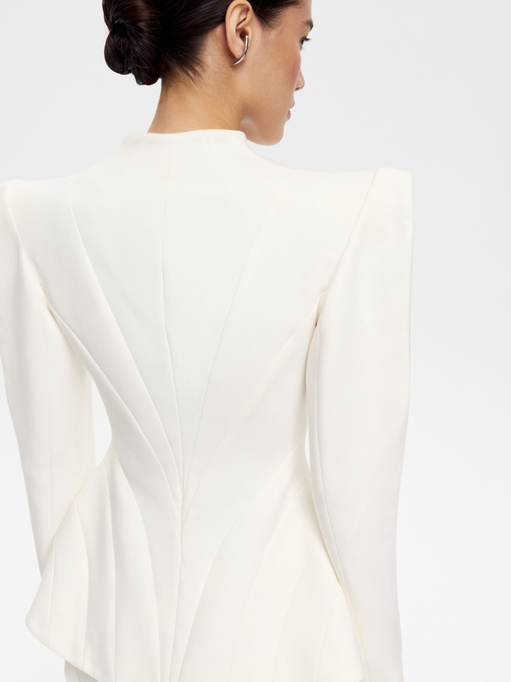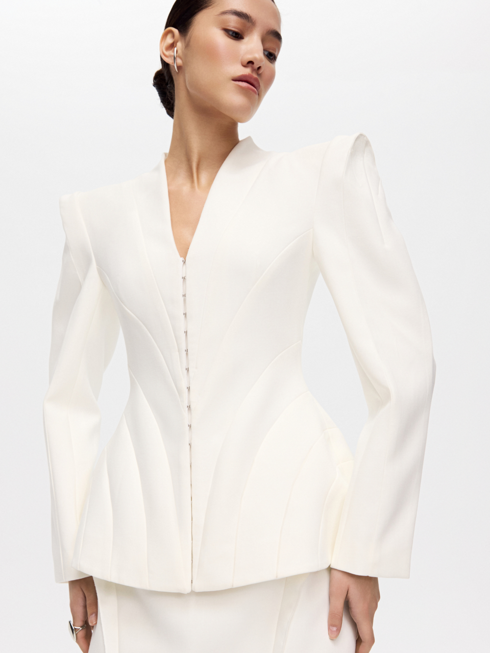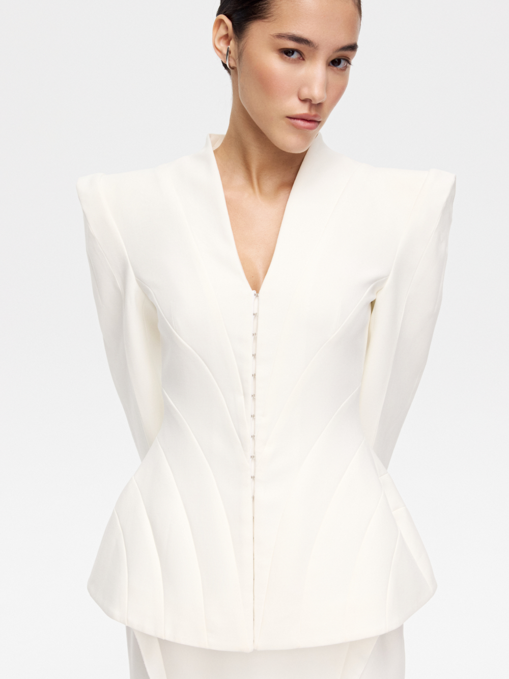 Жакет с рельефами – ключевая модель нового дропа, вдохновлённого эстетикой русского авангарда. Фигурные рельефы формируют точную посадку. Рукав с высоким плечом и выразительный силуэт усиливают образ, а застёжка на крючки подчёркивает его характер. V-образный вырез добавляет графичный акцент. Жакет выполнен из костюмной ткани и дополнен подкладкой с шёлком в составе.