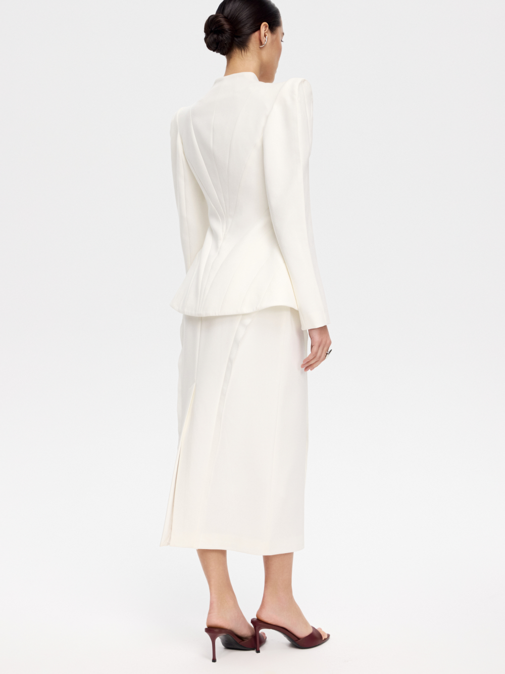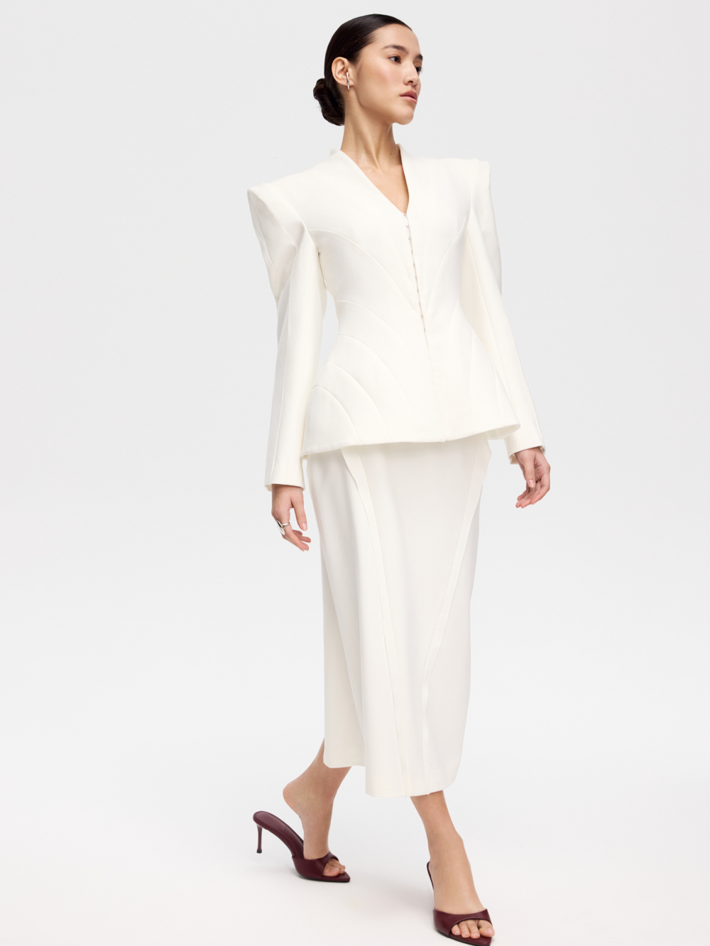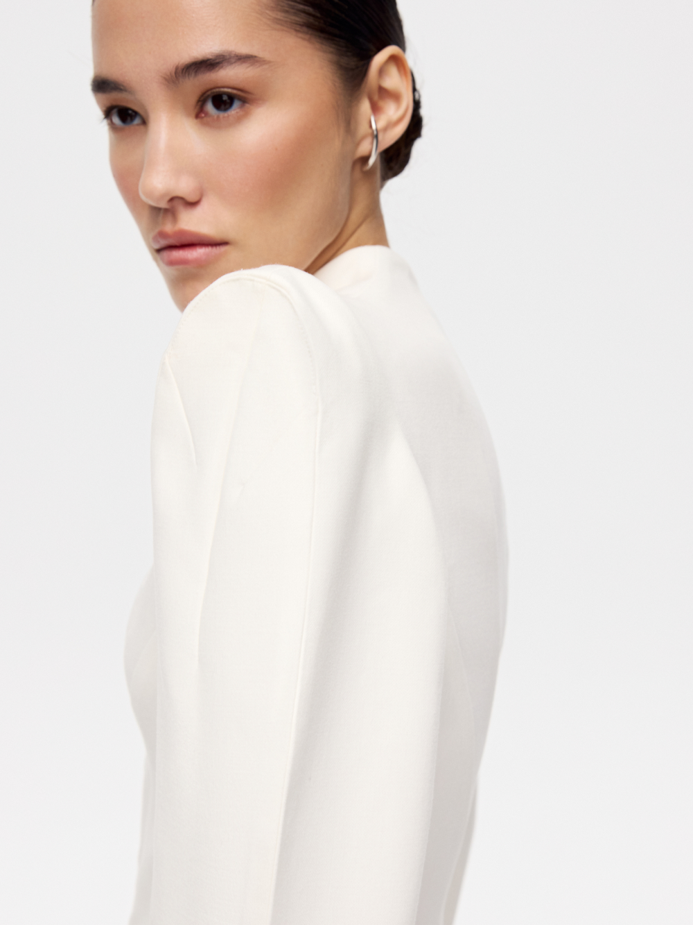 Жакет с рельефами – ключевая модель нового дропа, вдохновлённого эстетикой русского авангарда. Фигурные рельефы формируют точную посадку. Рукав с высоким плечом и выразительный силуэт усиливают образ, а застёжка на крючки подчёркивает его характер. V-образный вырез добавляет графичный акцент. Жакет выполнен из костюмной ткани и дополнен подкладкой с шёлком в составе.