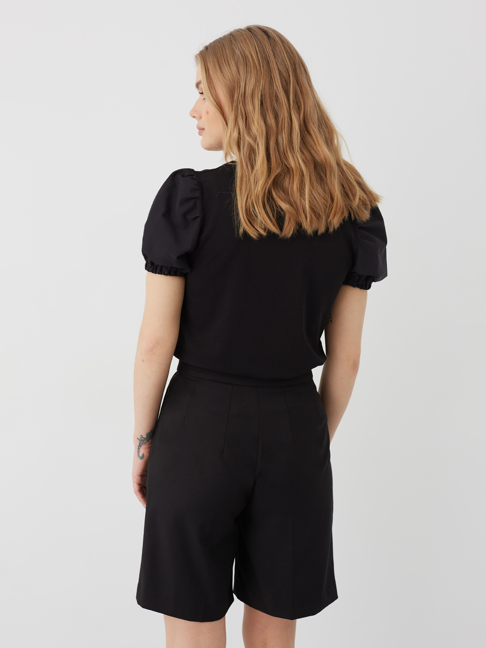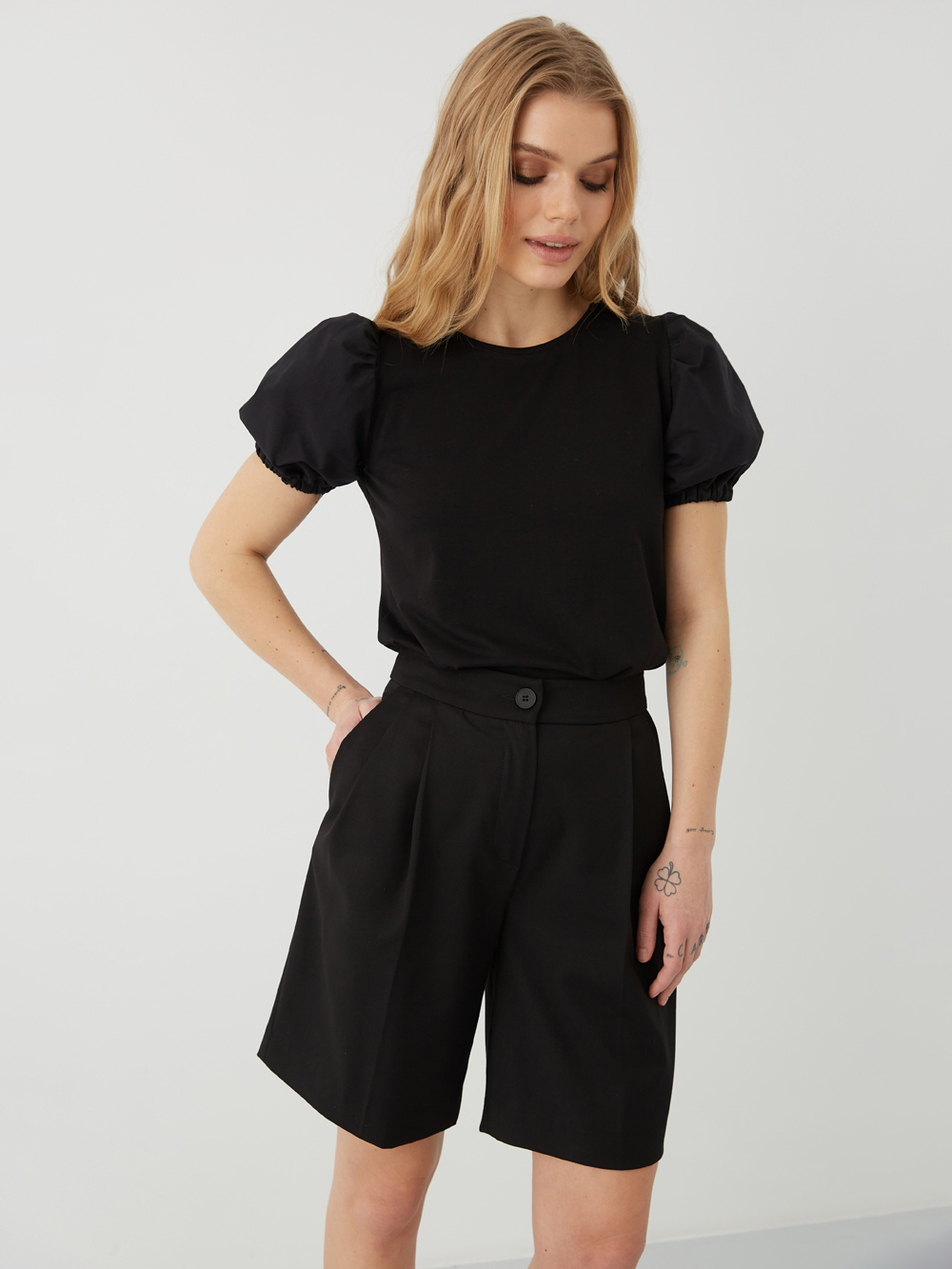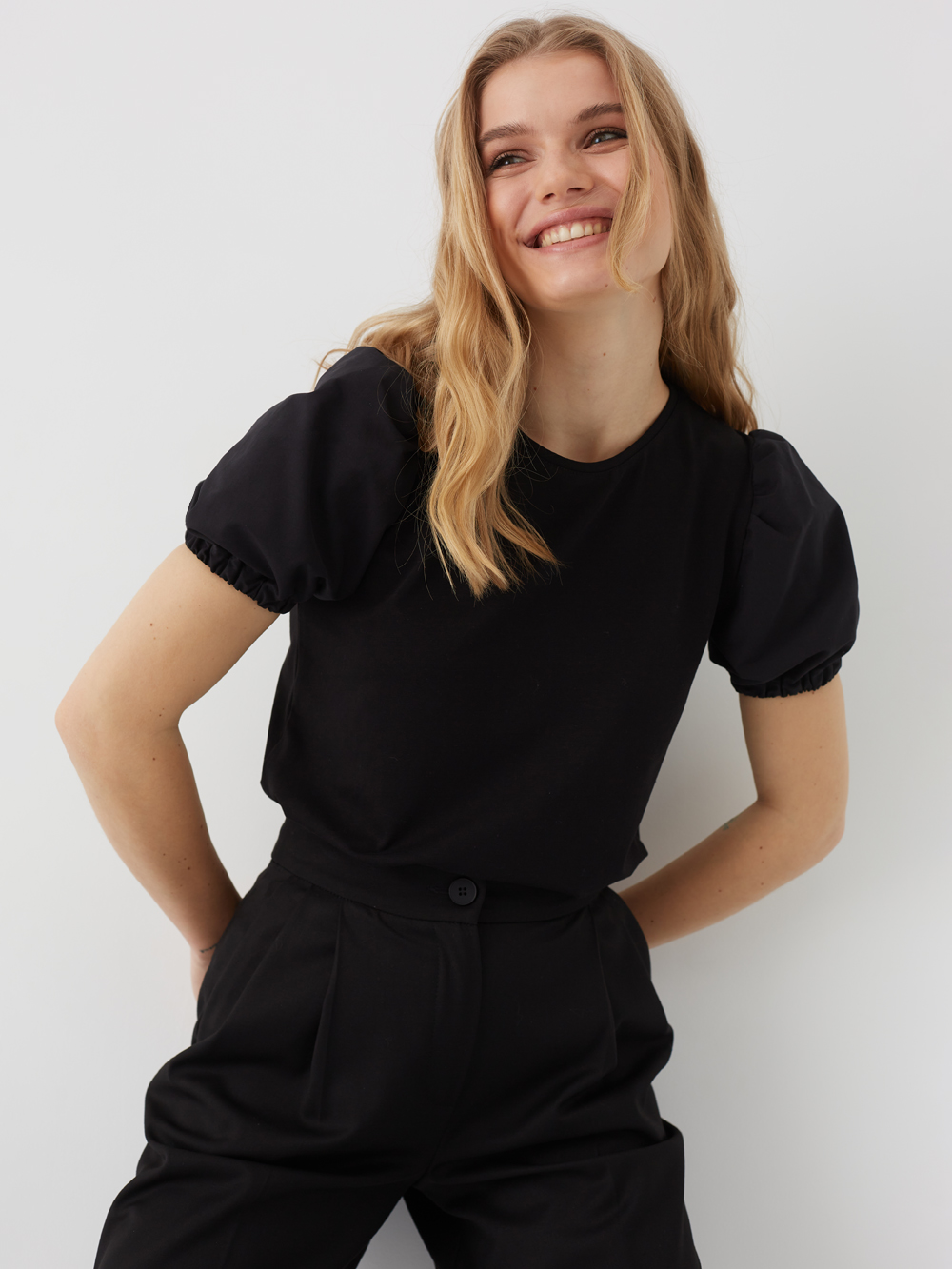 Футболка из трикотажа с объёмными рукавами из хлопковой ткани. Универсальная модель: можно составить образы для офиса с формальными брюками и бермудами, и так же легко её можно представить в легких повседневных луках с денимом, юбками и шортами. Футболка выполнена из мягкого, приятного к телу хлопка. В состав добавлен эластан, чтобы ткань не теряла форму, меньше мялась и за ней было легко ухаживать.