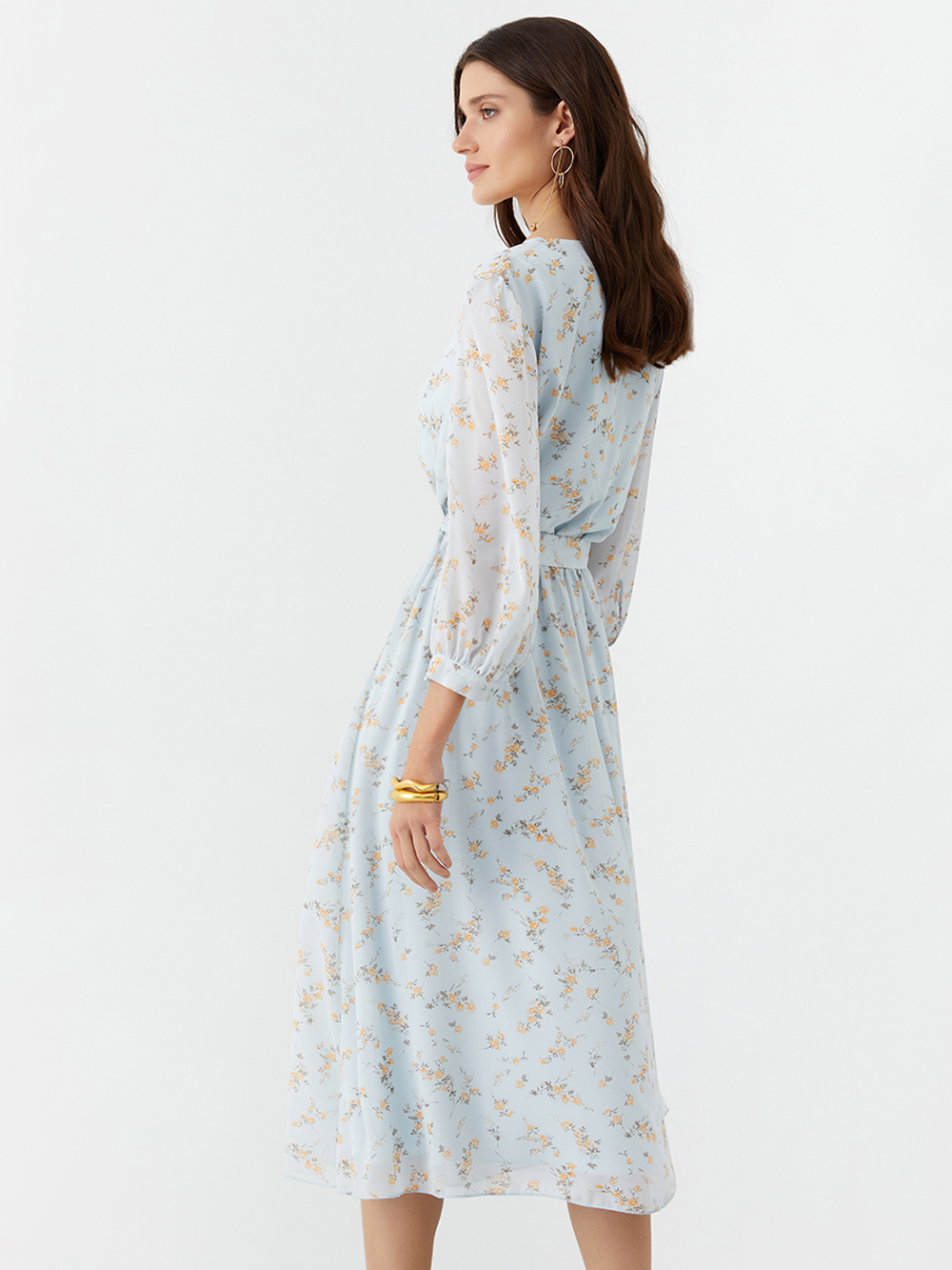 Платье из шифона в длине миди с рукавами ¾. Лёгкая романтичная модель с расклешённой юбкой и резинкой на талии подходит любому типу фигуры. В комплекте есть пояс. Платье выполнено из лёгкой ткани, приятной по ощущениям и немнущейся, и дополнено подкладкой с шёлком в составе.