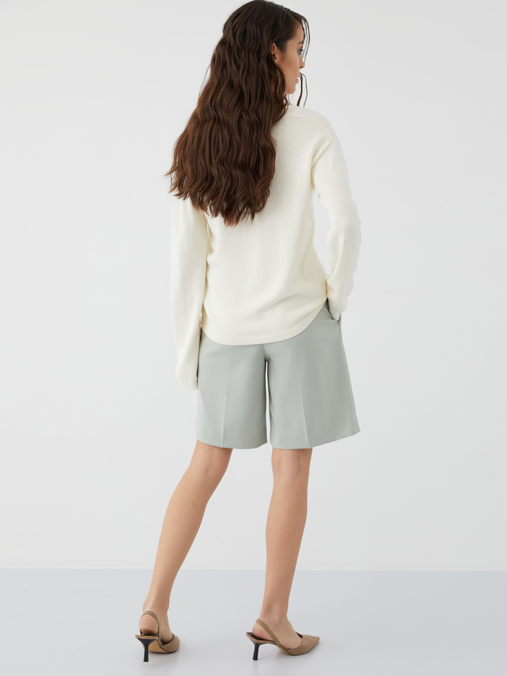 Удлинённые шорты-бермуды с высокой посадкой. Лаконичная модель с деликатной длиной составит формальный комплект с жакетом, а также будет отлично сочетаться с трикотажем и с базовыми футболками и топами. Бермуды застёгиваются на пуговицу и молнию. Выполнены из костюмной поливискозы высокого качества: она приятная к телу и не будет сильно сминаться. Есть карманы.