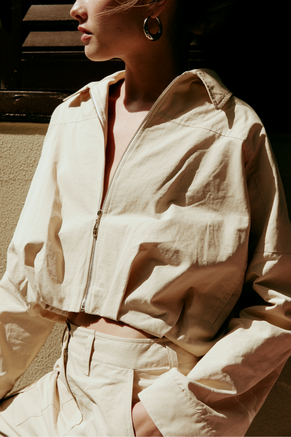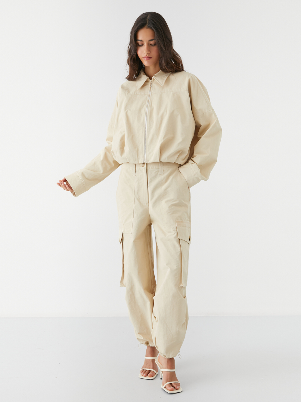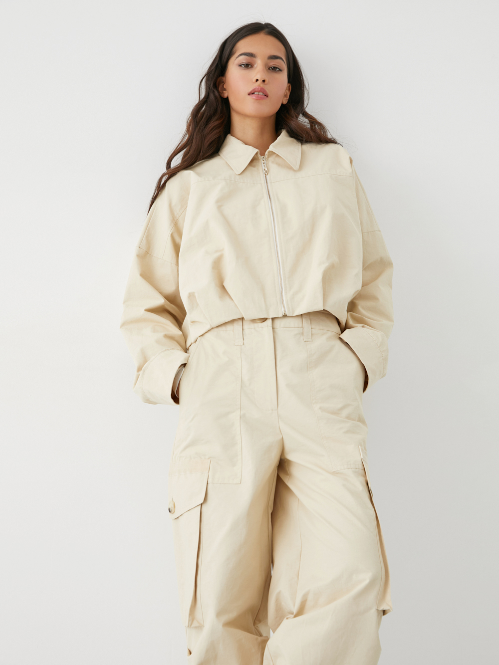 Ветровка на молнии. Выполнена из плотной ткани с хлопком в составе. Особенность укороченной модели – складки, заложенные внизу и придающие ветровке актуальную объёмную форму. Есть карманы. Ветровка идеально дополнит стильные образы и составит дуэт с брюками карго из коллекции SOLO·U.