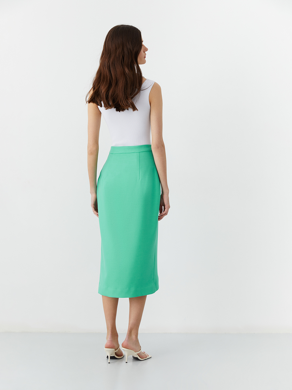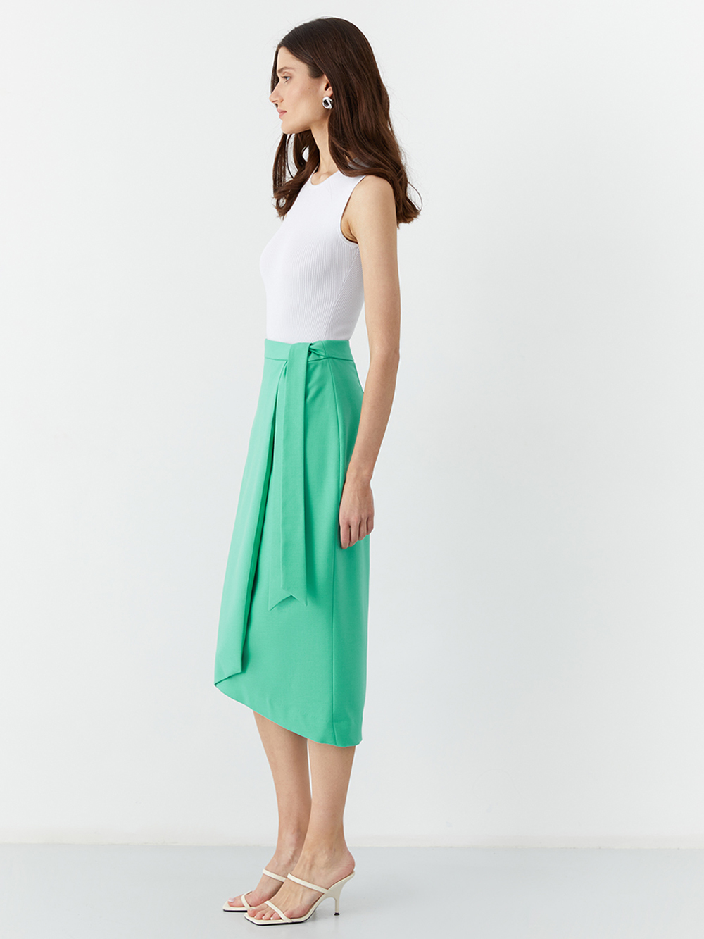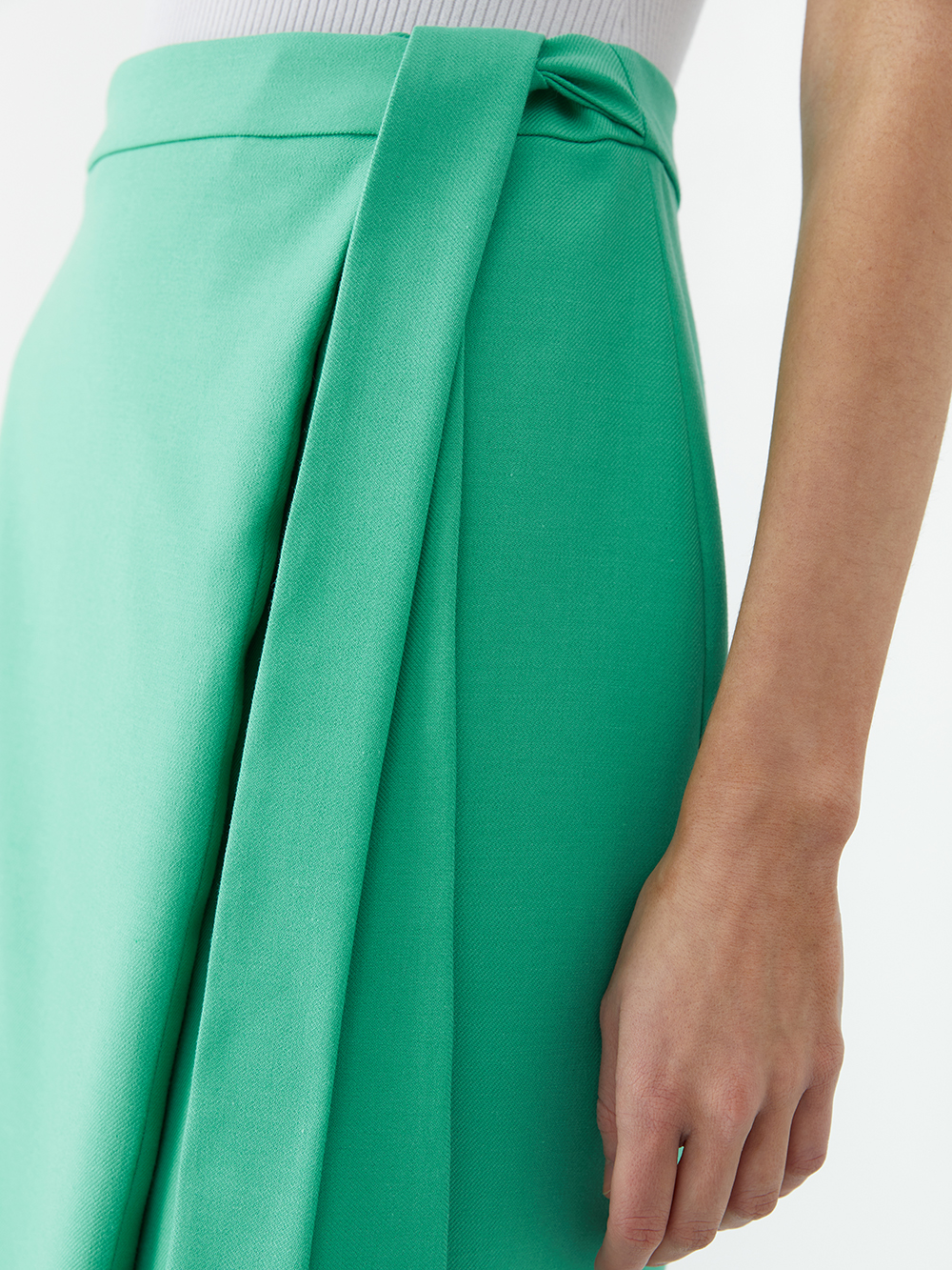 Юбка на запах длины миди. Главное преимущество этой модели - она визуально вытягивает и создаёт стройный женственный силуэт. В зависимости от стилизации юбка подойдёт как для свободных повседневных, так и для формальных образов. Фиксируется на талии поясом и внутренней пуговицей. Юбка выполнена из костюмной поливискозы высокого качества и дополнена подкладкой с шёлком.