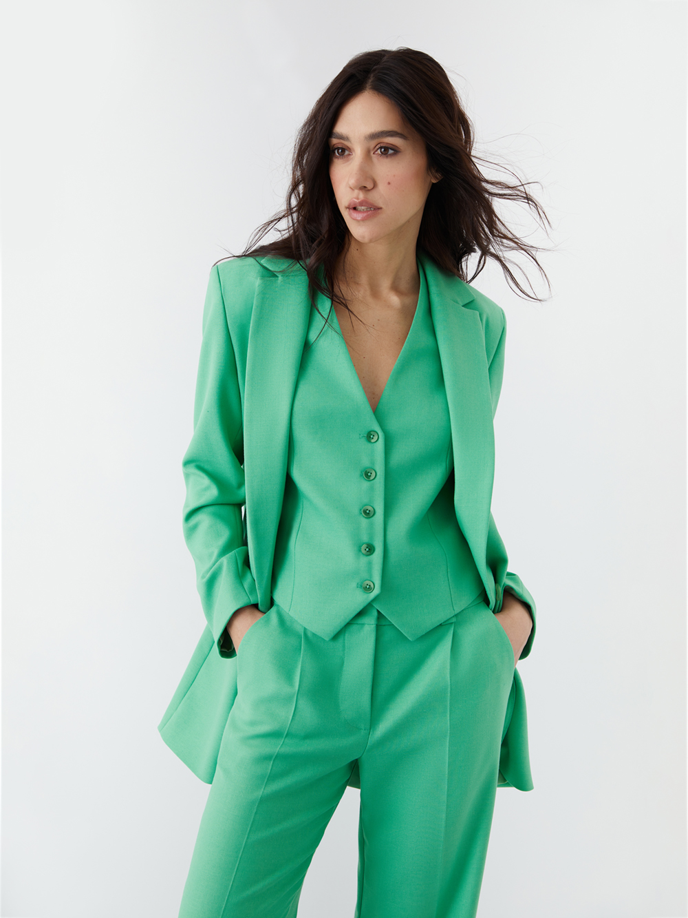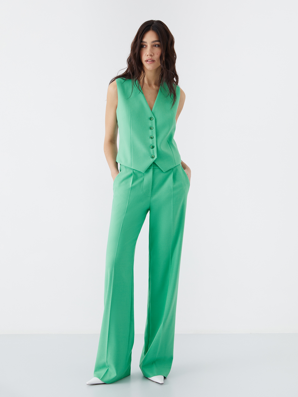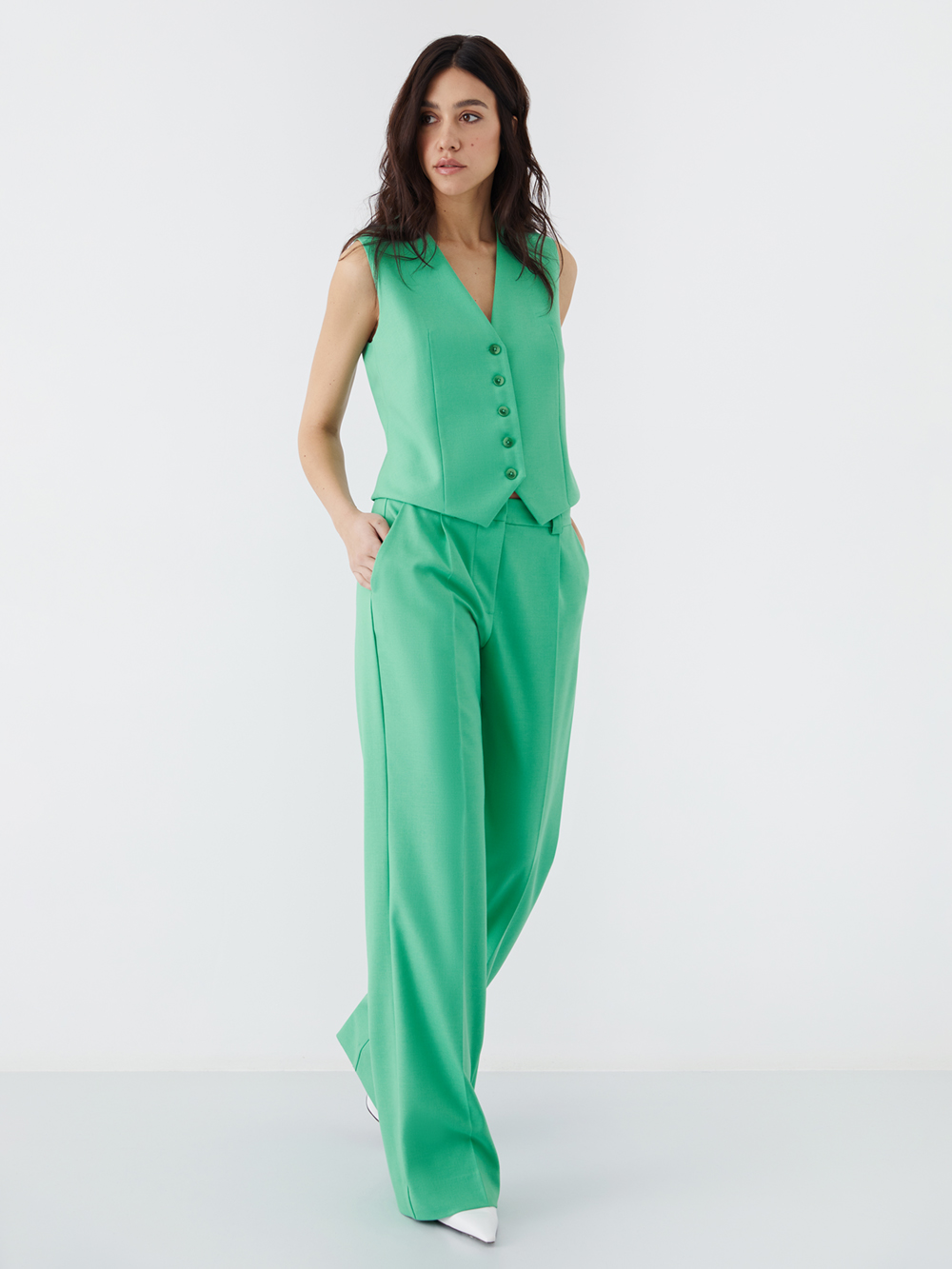 Жилет на пуговицах. Элегантная модель с полуприлегающим силуэтом отлично смотрится и сольно, и в сочетании с жакетом. Жилет выполнен из поливискозы высокого качества, а благодаря подкладке с шёлком его можно носить на голое тело.