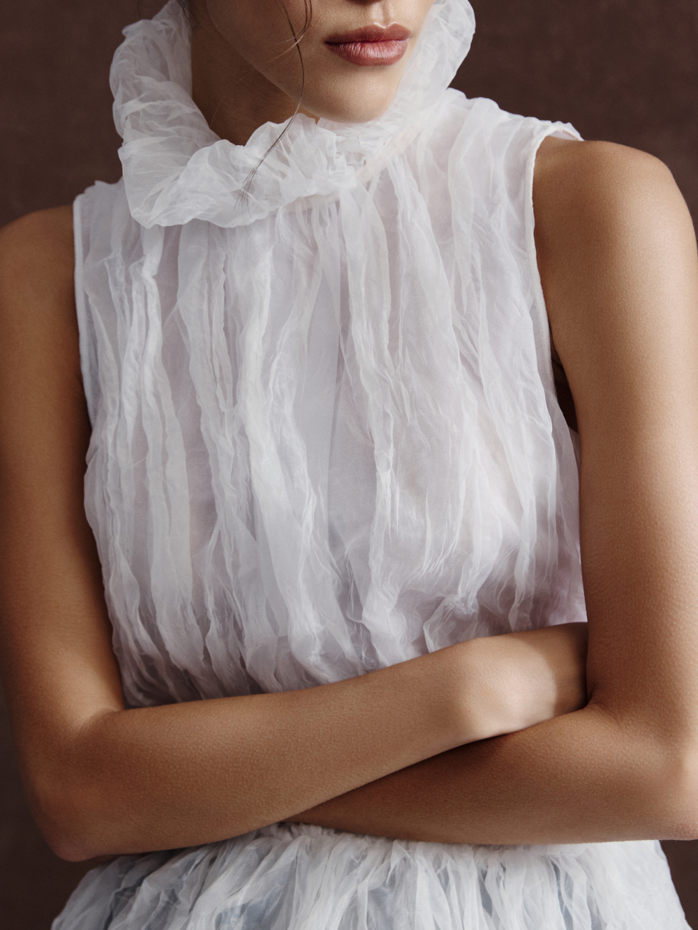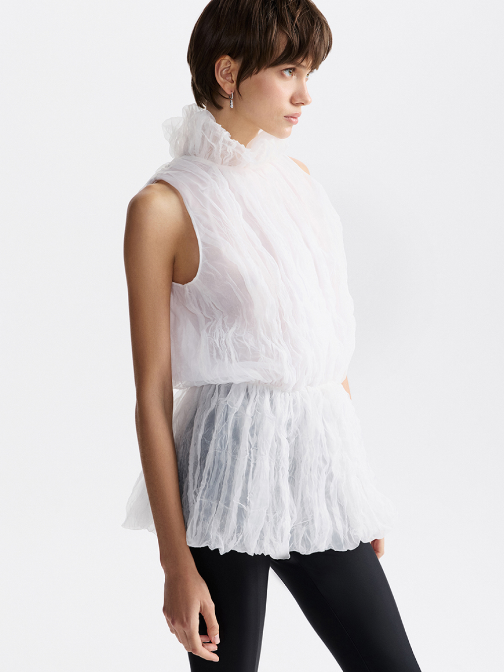 Воздушный топ с баской создан для лимитированной вечерней коллекции – он сделает образ нарядным и заметным без усилий. Топ выполнен из шифона с эффектом гофре. Визуальную лёгкость полупрозрачной ткани подчёркивают баска и мягкая стойка воротника. Топ очень комфортный: на поясе удобная резинка, есть приятная тактильно подкладка. Топ застёгивается на жемчужную пуговицу на спинке.