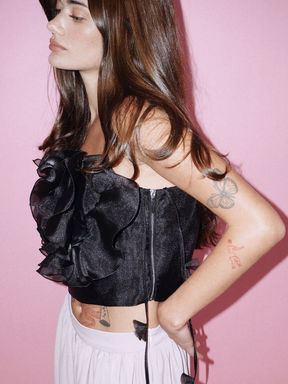 Топ Camellia – неименный бестселлер. Изящный топ с камелией из органзы может послужить основой вечернего образа и украсить дневной – в сочетании с джинсами. В создании модели много сложной ручной работы, поэтому топ входит в серию limited. Топ выполнен из гладкой приятной ткани с шёлком в составе и дополнен декором из прозрачной органзы. Тонкие бретели можно регулировать по длине. Топ застёгивается на удобную молнию сбоку.