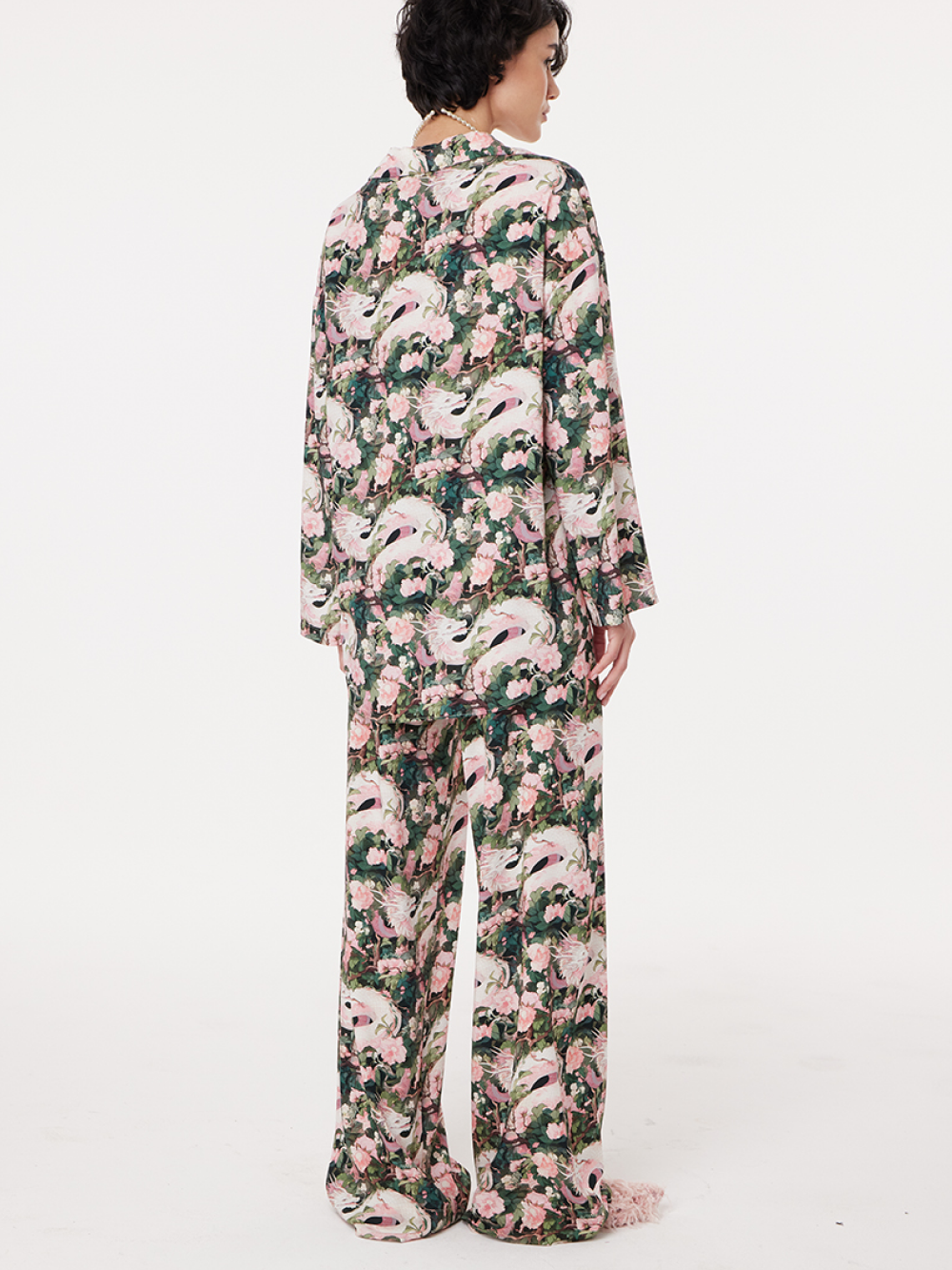 Широкие брюки на резинке выполнены из гладкого струящегося вискозного шёлка – приятного тактильно, мягкого и дышащего. Дорогая внешне и по ощущениям ткань достаточно плотная, чтобы выглядеть убедительно и красиво ниспадать. Универсальная и всегда актуальная модель, в которой будет комфортно не только на городской прогулке и в отпуске, но и дома. Есть удобные карманы. Уникальный паттерн разработан дизайнерами TRUE RED с помощью нейросети. Предлагаем создать стильный сет с рубашкой из той же ткани или носить отдельно.