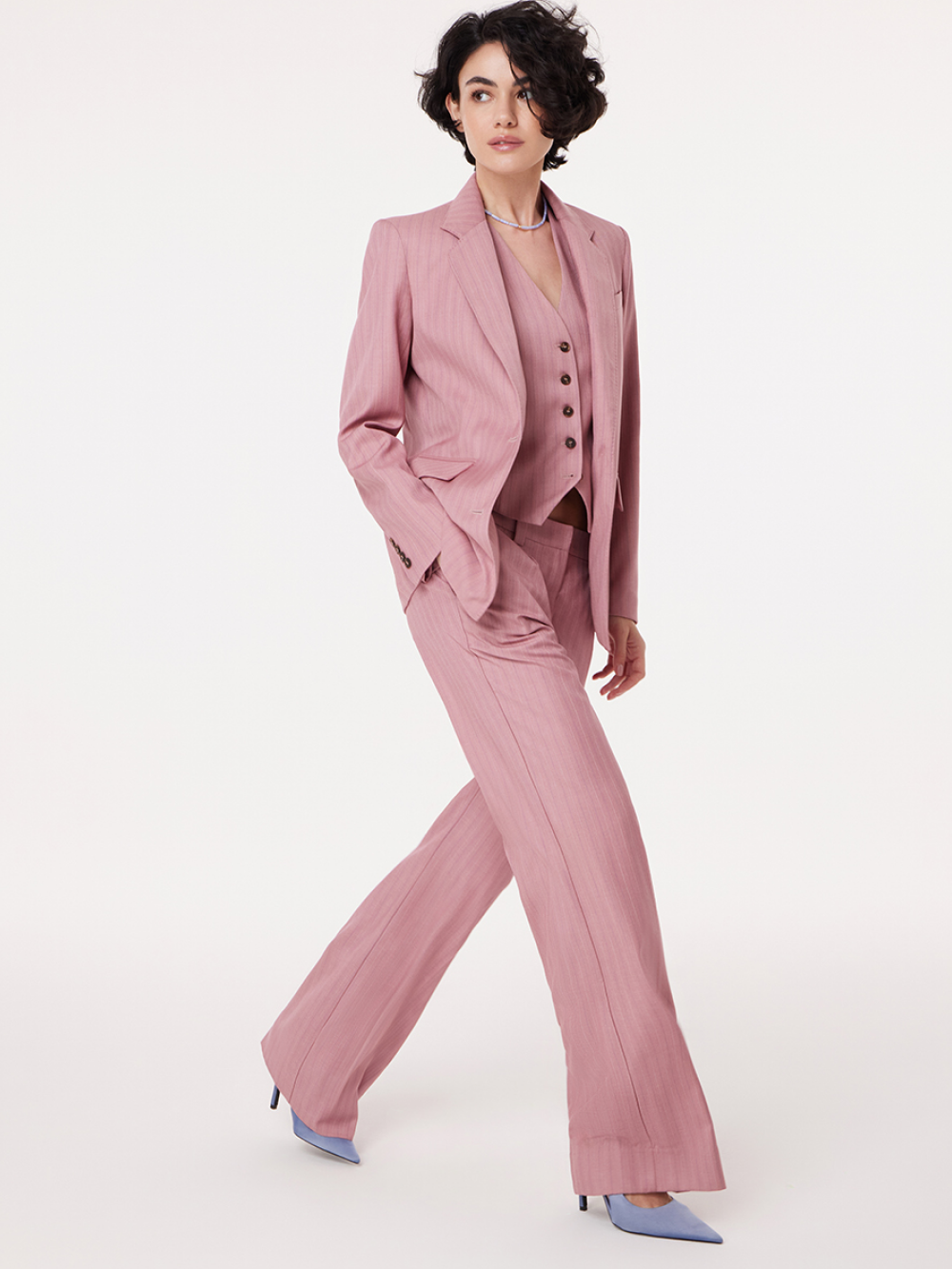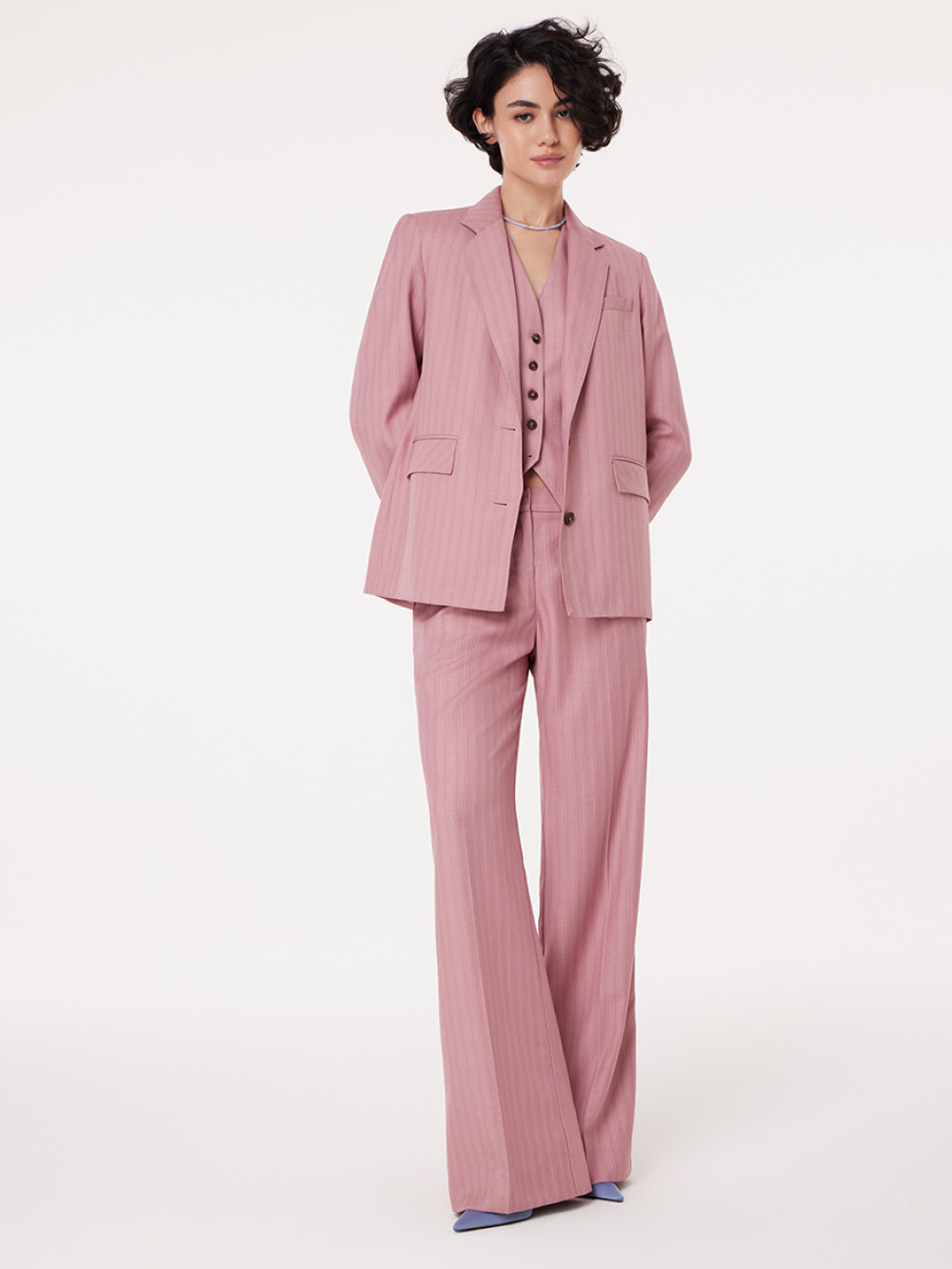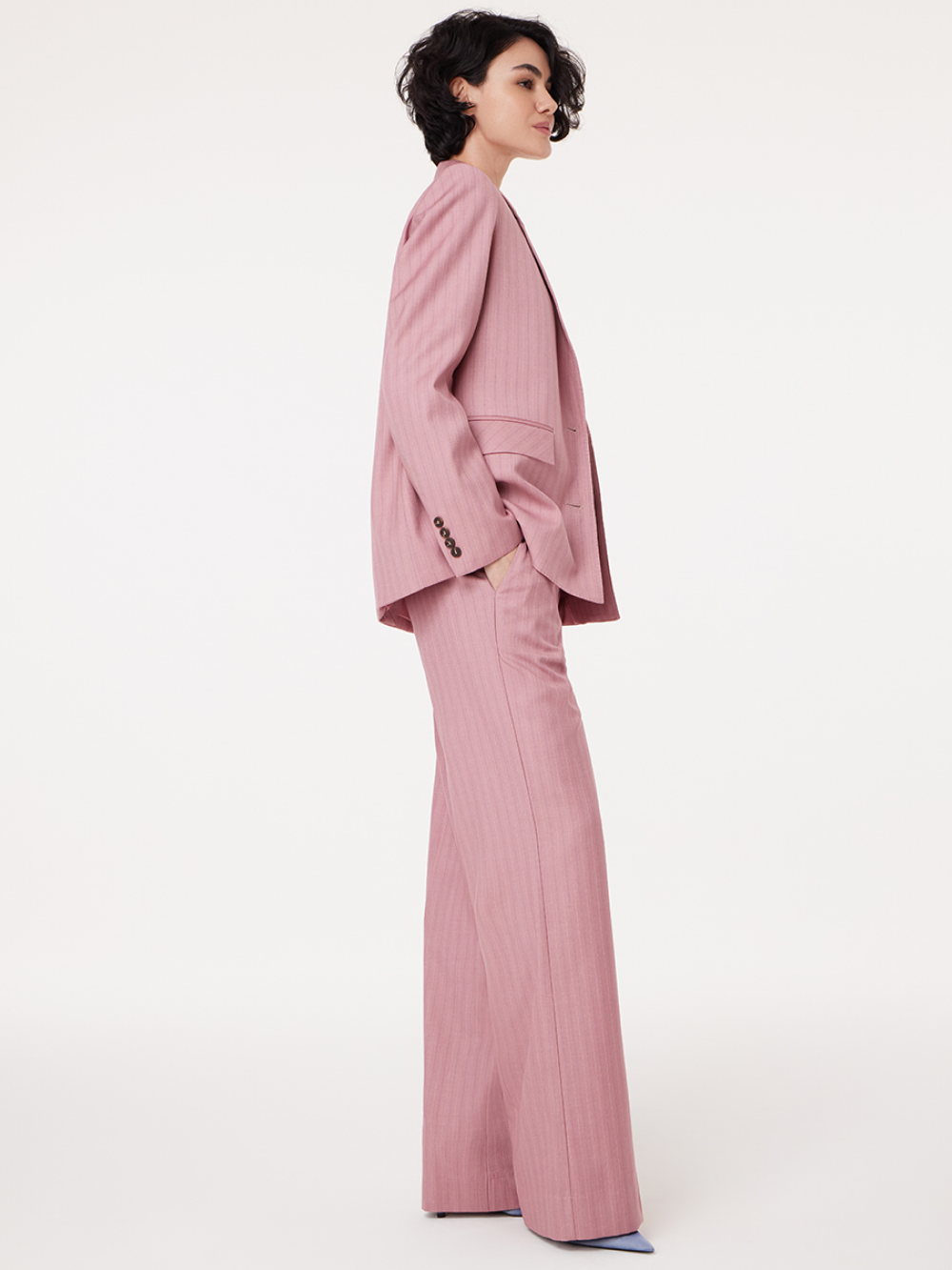 Элегантные прямые брюки со стрелками визуально удлиняют силуэт и делают фигуру стройнее. Актуальную модель с заниженной посадкой можно стилизовать как для формальных, так и для повседневных образов. Брюки застёгиваются на крючок и молнию. Есть карманы. Брюки выполнены из костюмной ткани высокого качества с вискозным шёлком в составе.