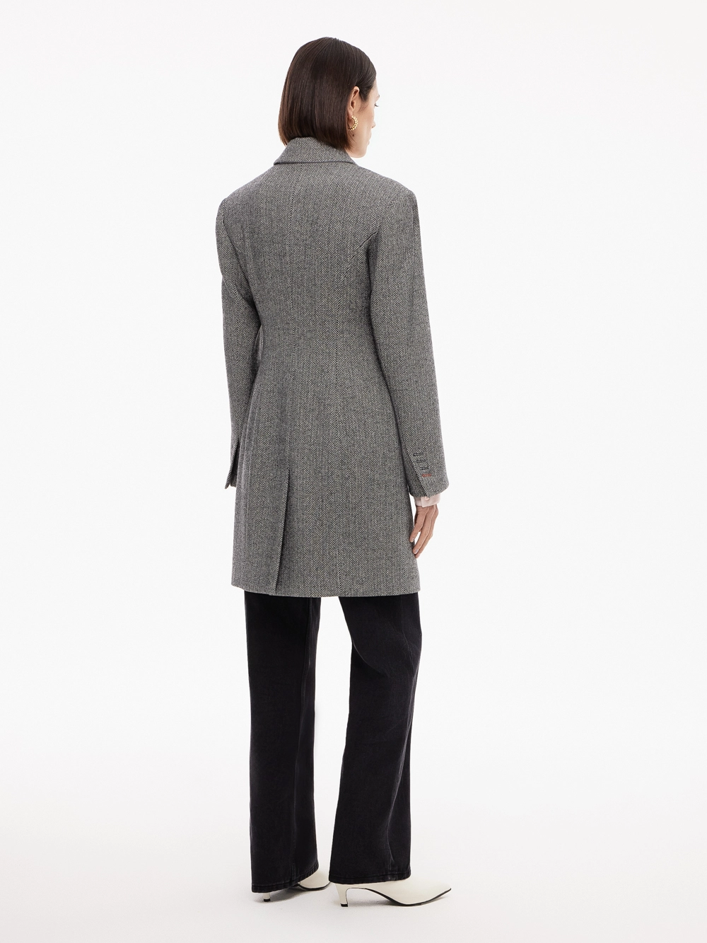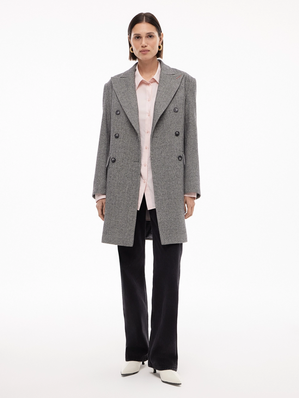 Для двубортного пальто мы выбрали плотную ткань превосходного качества на основе шерсти: согревающую, мягкую и долговечную. Есть подкладка с шёлком в составе. У пальто лаконичный дизайн с аккуратным прилеганием, слегка расширенные плечи и акцент на талии – пальто тёплое, но при этом не тяжёлое и не объёмное. Предлагаем носить и с легкими платьями, и с джинсами. Рекомендуемый температурный режим от +12°C до +5°C.