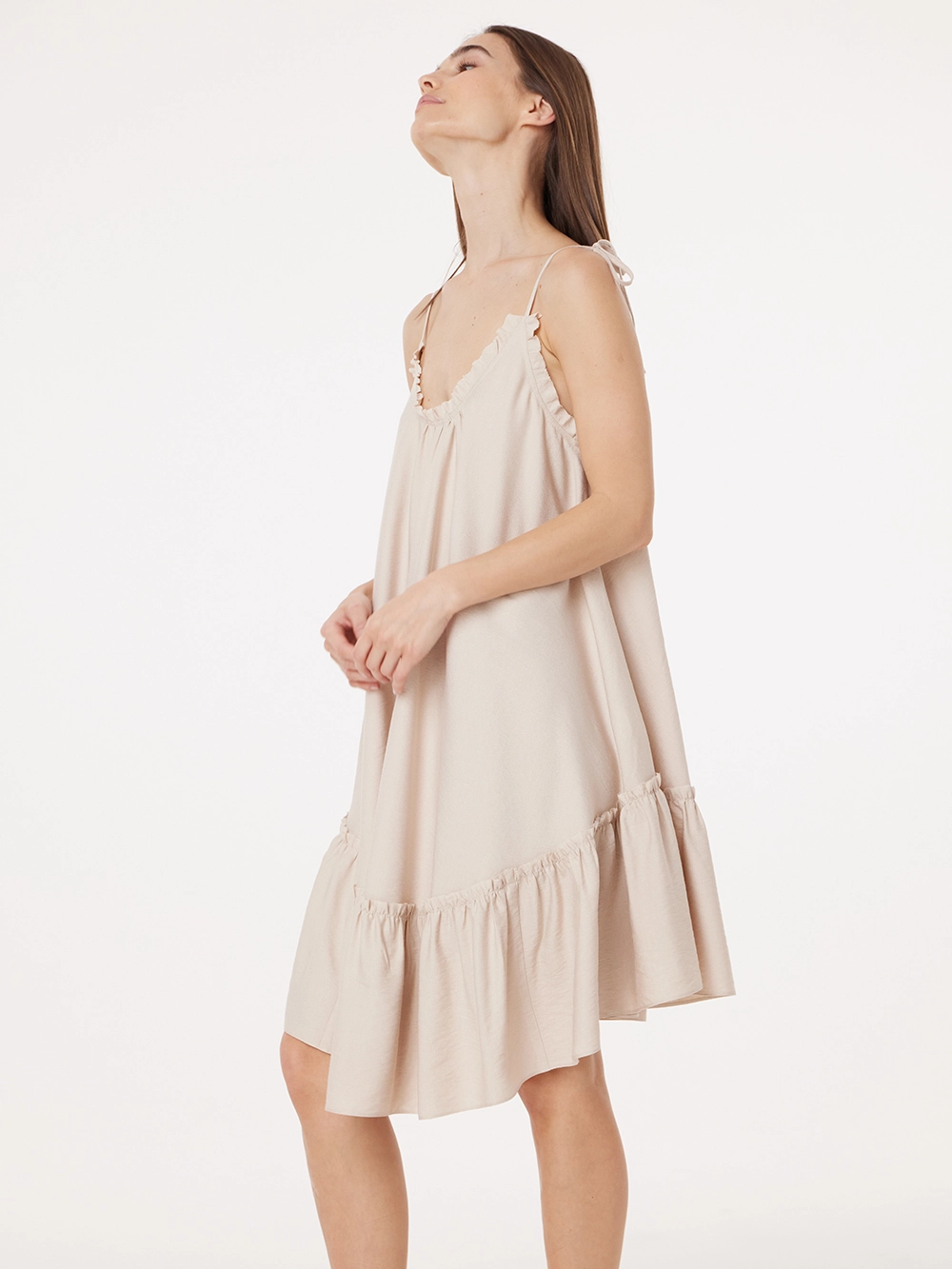 Сарафан из вискозы на тонких бретелях создан для лёгких летних образов в городе и на отдыхе. Романтичные оборки и открытая спина делают модель женственной и очень нежной. Бретели можно полностью развязать и завязать, как вам нравится. Сарафан сшит из лёгкой, мягкой, дышащей ткани на основе вискозы – идеально для жаркой погоды.