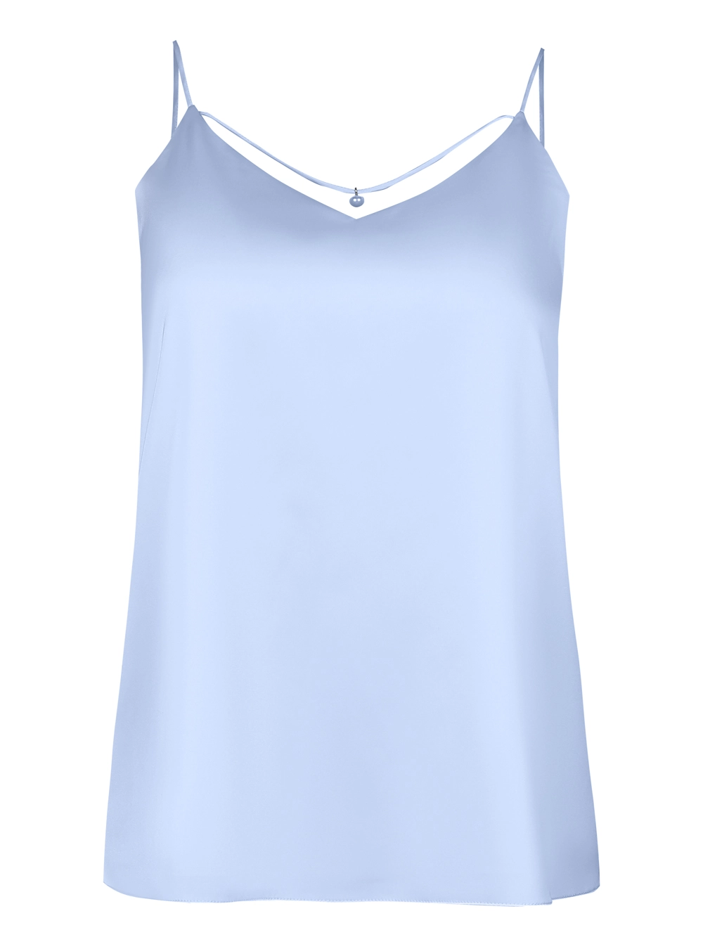 Топ в бельевом стиле на тонких бретелях. Выполнен из гладкой струящейся ткани с шёлком в составе. Она приятна к коже, мало мнётся, долговечна и не требует сложного ухода. Топ двойной, поэтому не просвечивается и отличается красивой посадкой. Украшен декоративной бусинкой.