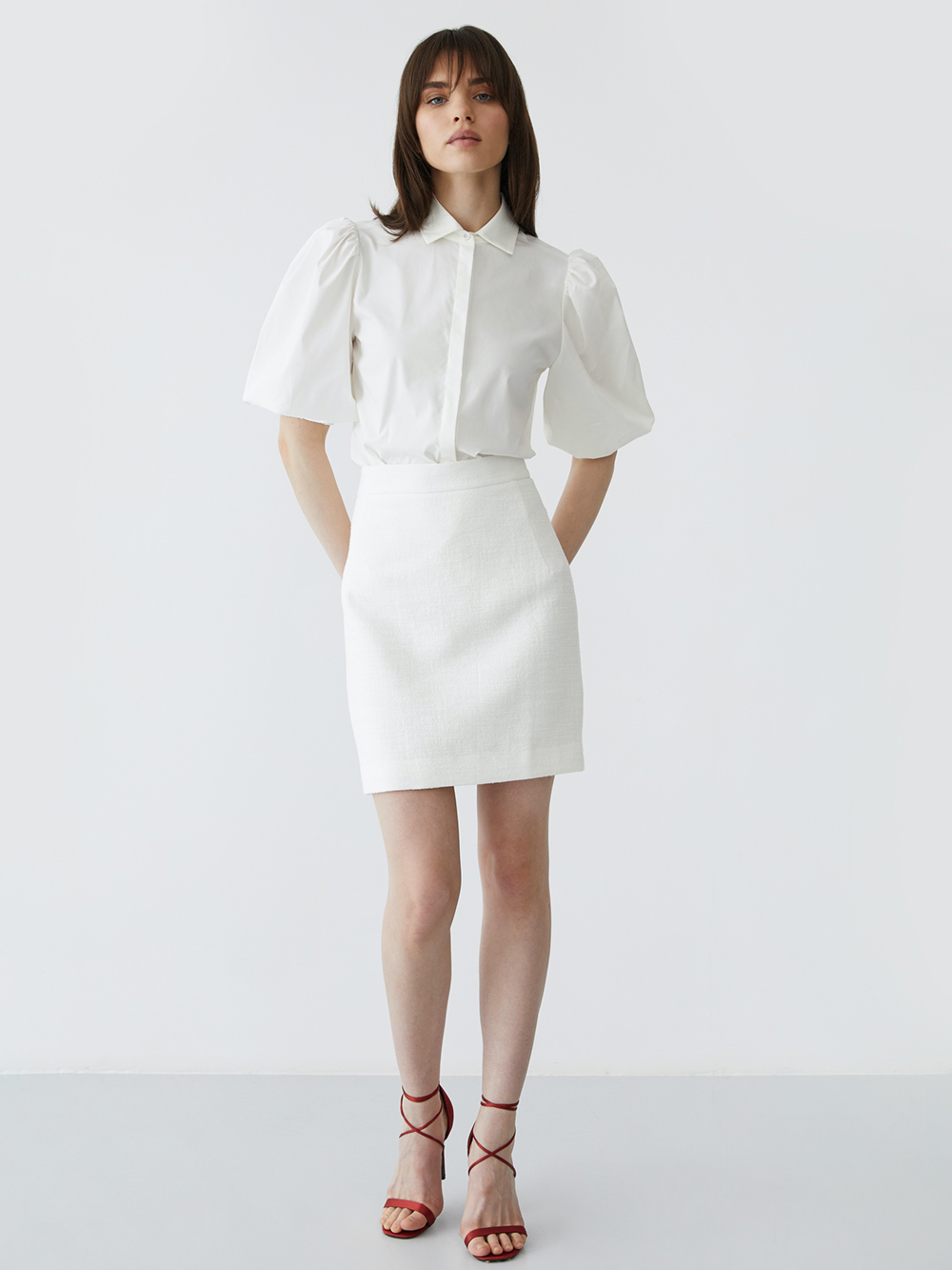 Хлопковая блузка с акцентными рукавами. Эффектная модель, к которой легко подобрать пару: юбку или брюки для женственного формального образа, деним или экокожу для повседневного лука. Мы выбрали для блузки приятную к телу ткань из мягкого хлопка с искусственными волокнами: ткань будет комфортной и при этом пластичной, долговечной и не будет сильно мяться.