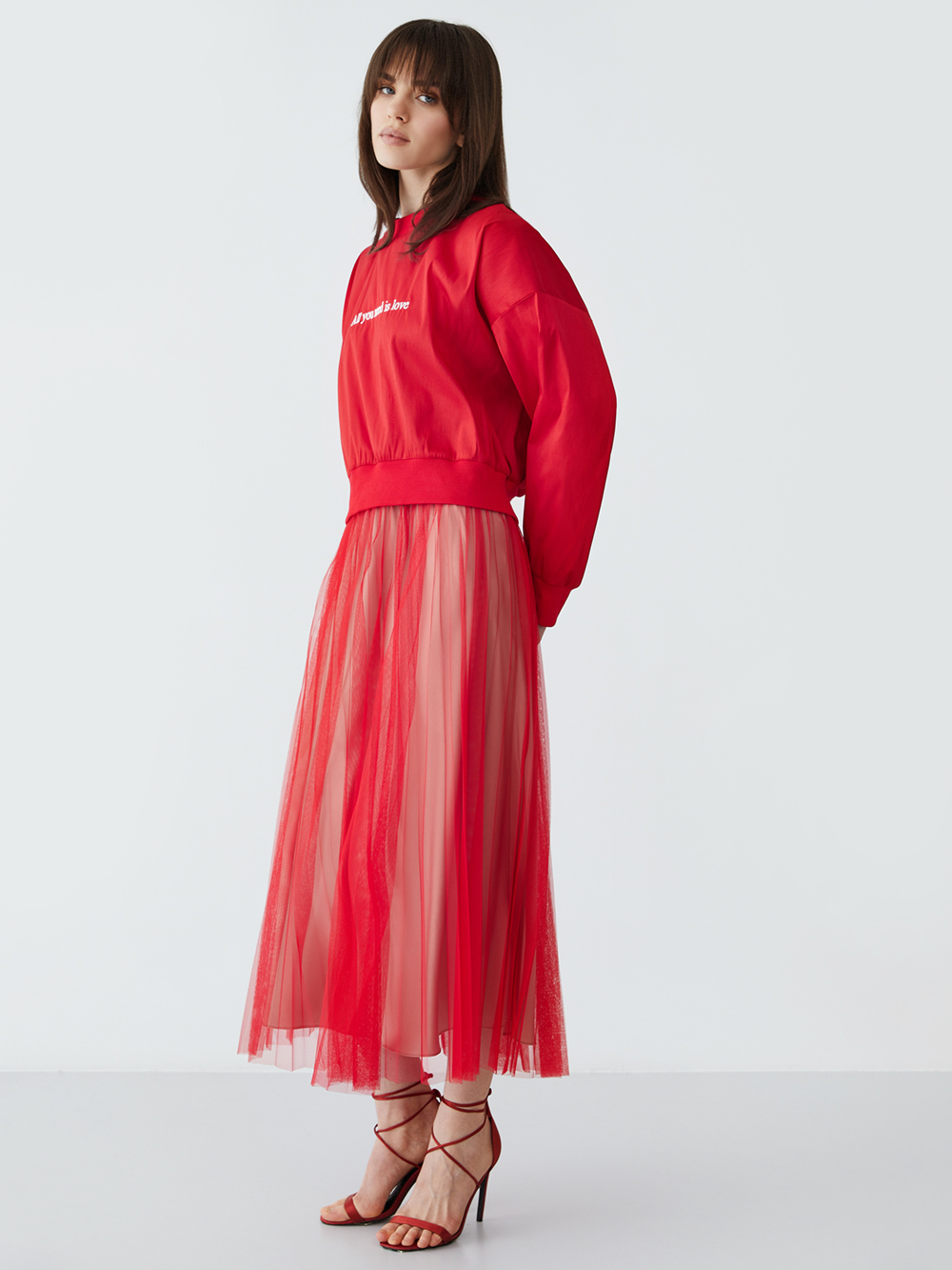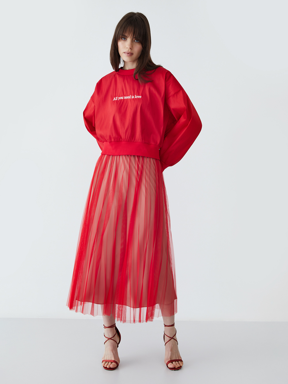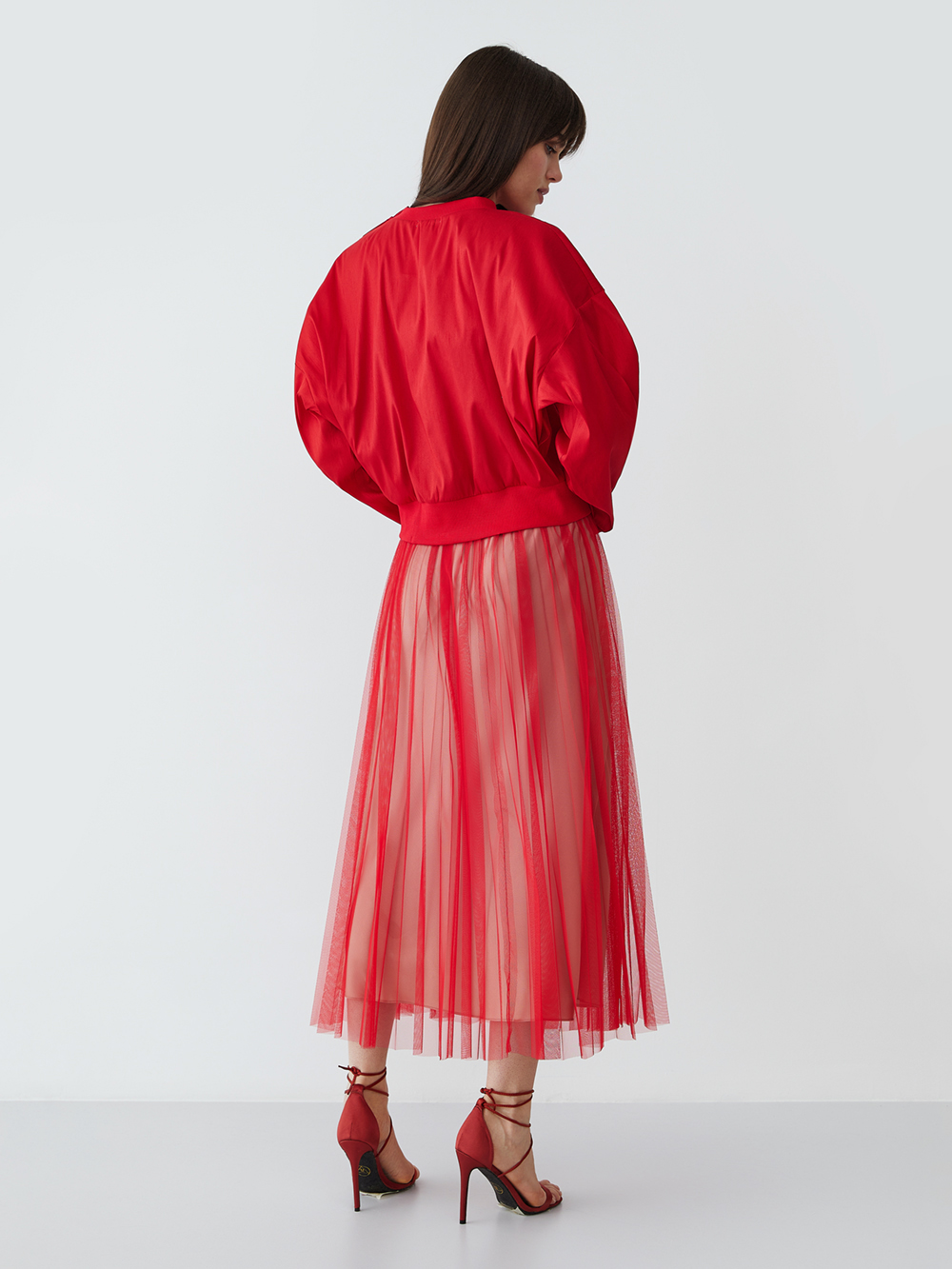 Юбка в длине миди состоит из двух слоёв: гофрированной сетки и нижней юбки с шёлком в составе. Воздушная и нежная модель, лёгкость которой подчёркнута контрастом яркой прозрачной сетки и нюдового шёлка. Юбка на комфортной широкой резинке. Юбку можно стилизовать как для вечерних выходов, так и для повседневных луков.