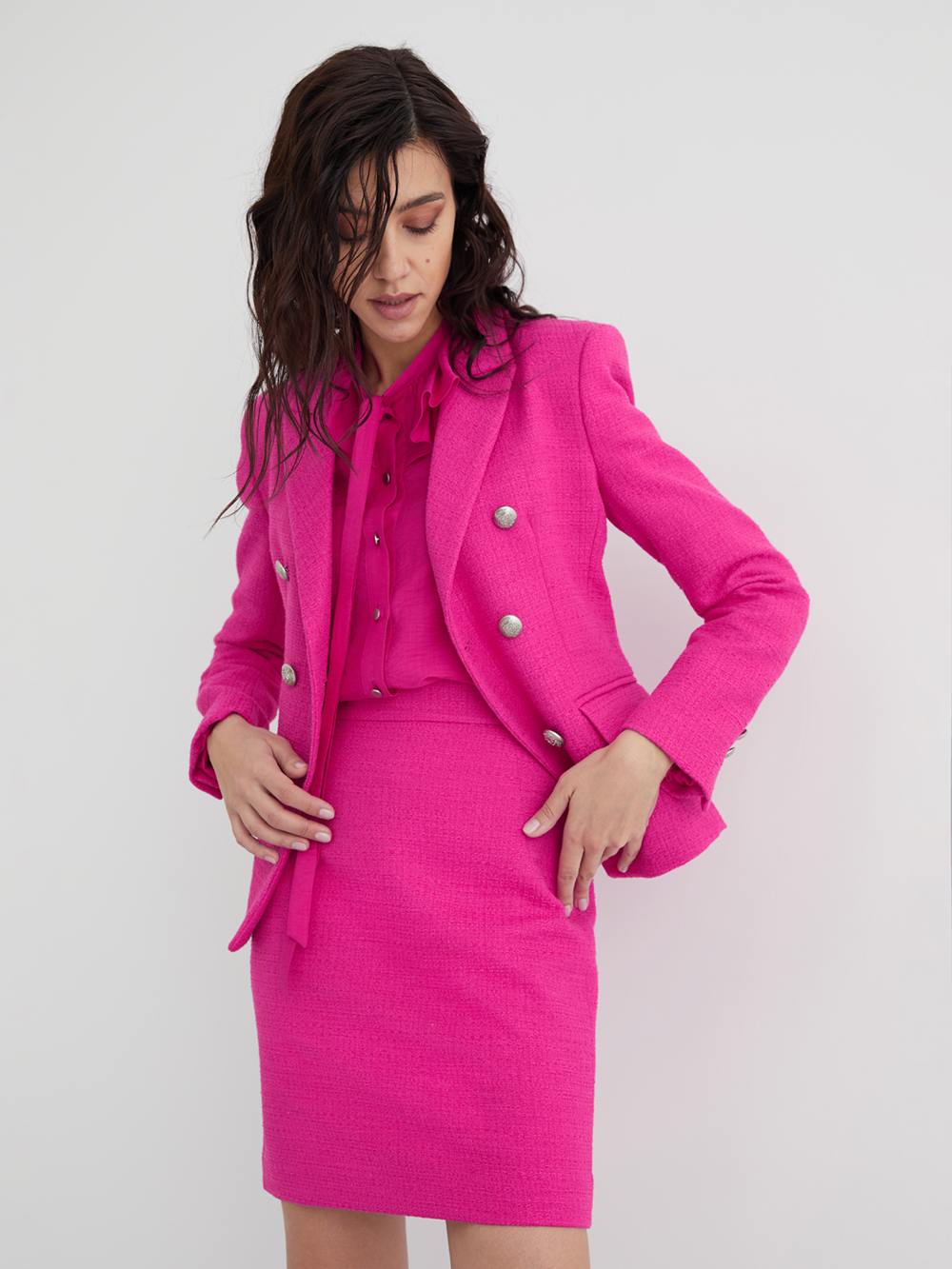Юбка мини с посадкой на талии. Лаконичная базовая модель выполнена из актуального хлопкового твида, долговечного, приятного по ощущениям и комфортного в тёплый сезон. Есть подкладка с шёлком в составе. Застёгивается на молнию сзади. Юбка идеально подходит как для создания формального образа с жакетом из комплекта, так и для стилизации с блузками и трикотажем.