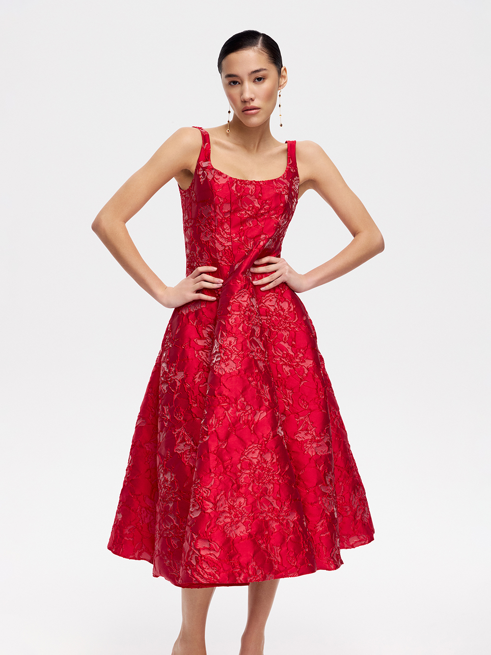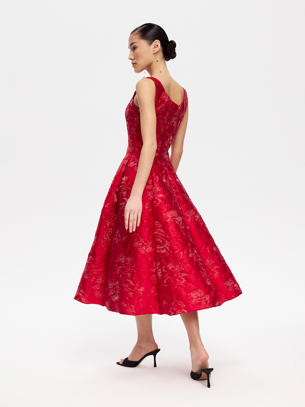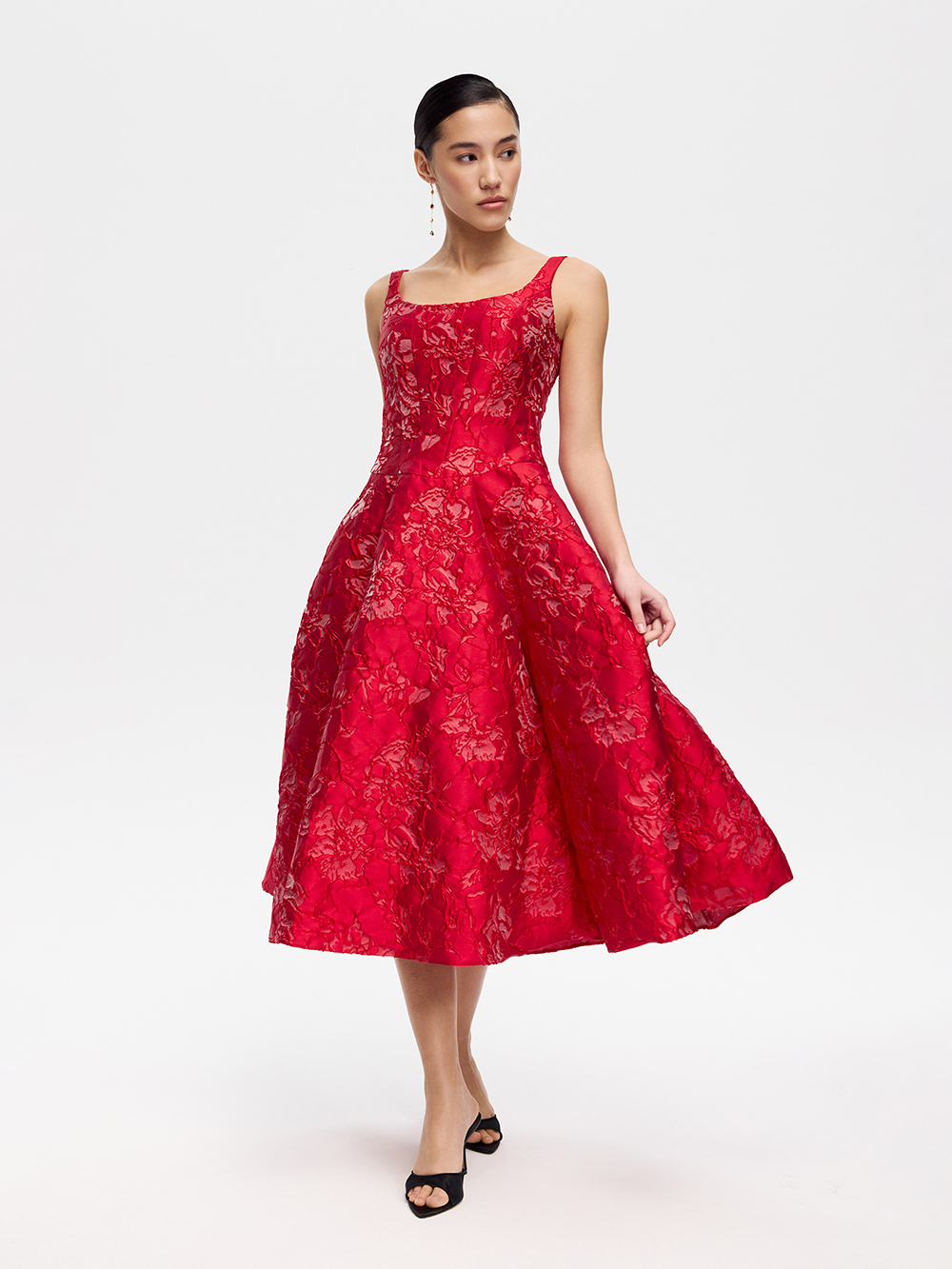 Платье из тафты с фактурным цветочным орнаментом создано для особенных событий. Корсетный лиф с рельефами и пышная юбка подчёркивают талию и формируют женственный силуэт. Декоративная плотная ткань, созданная специально для нарядных изделий, красиво держит форму. Платье дополнено приятной тактильно подкладкой с шёлком в составе. Платье застёгивается на молнию сзади.