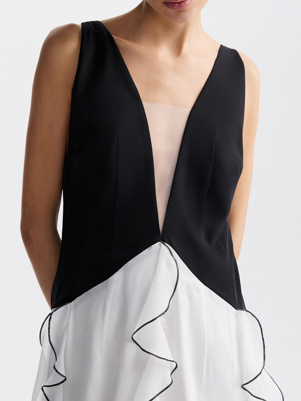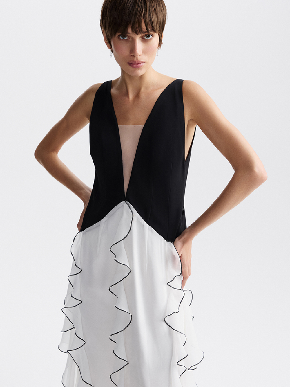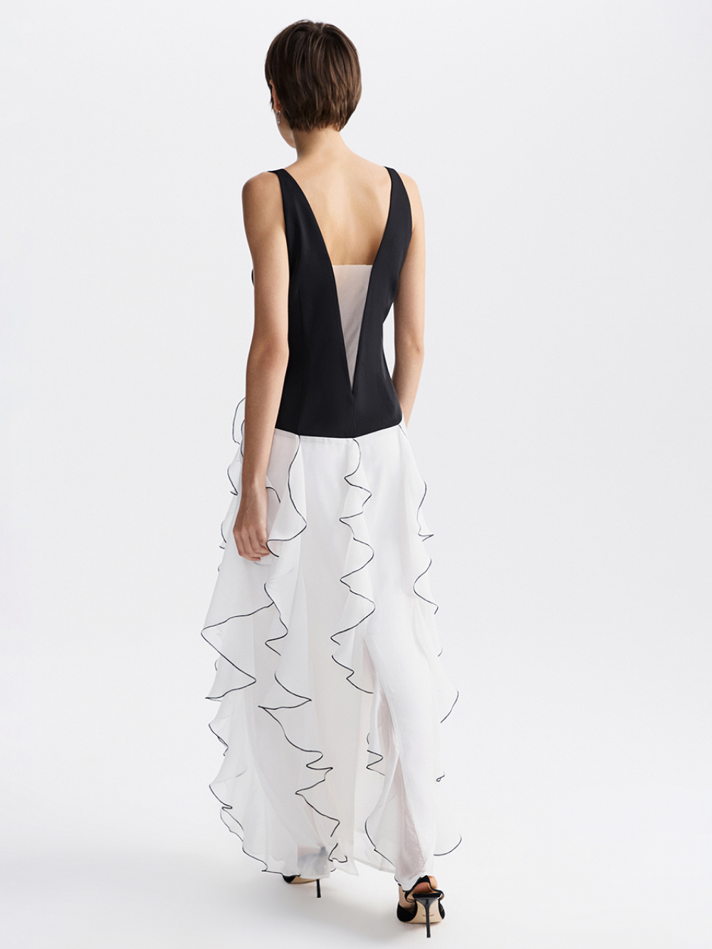 Вечернее контрастное платье в пол создано специально для лимитированного дропа. Пластичный лиф с глубоким, комплиментарным V-образным вырезом, который деликатно прикрывается мягкой сеткой. Юбка выполнена из невесомого воздушного шифона, ниспадающего воланами, украшенными декоративным швом. Платье дополнено подкладкой на основе шёлка. Есть разрез сзади. Платье застёгивается на молнию сбоку.