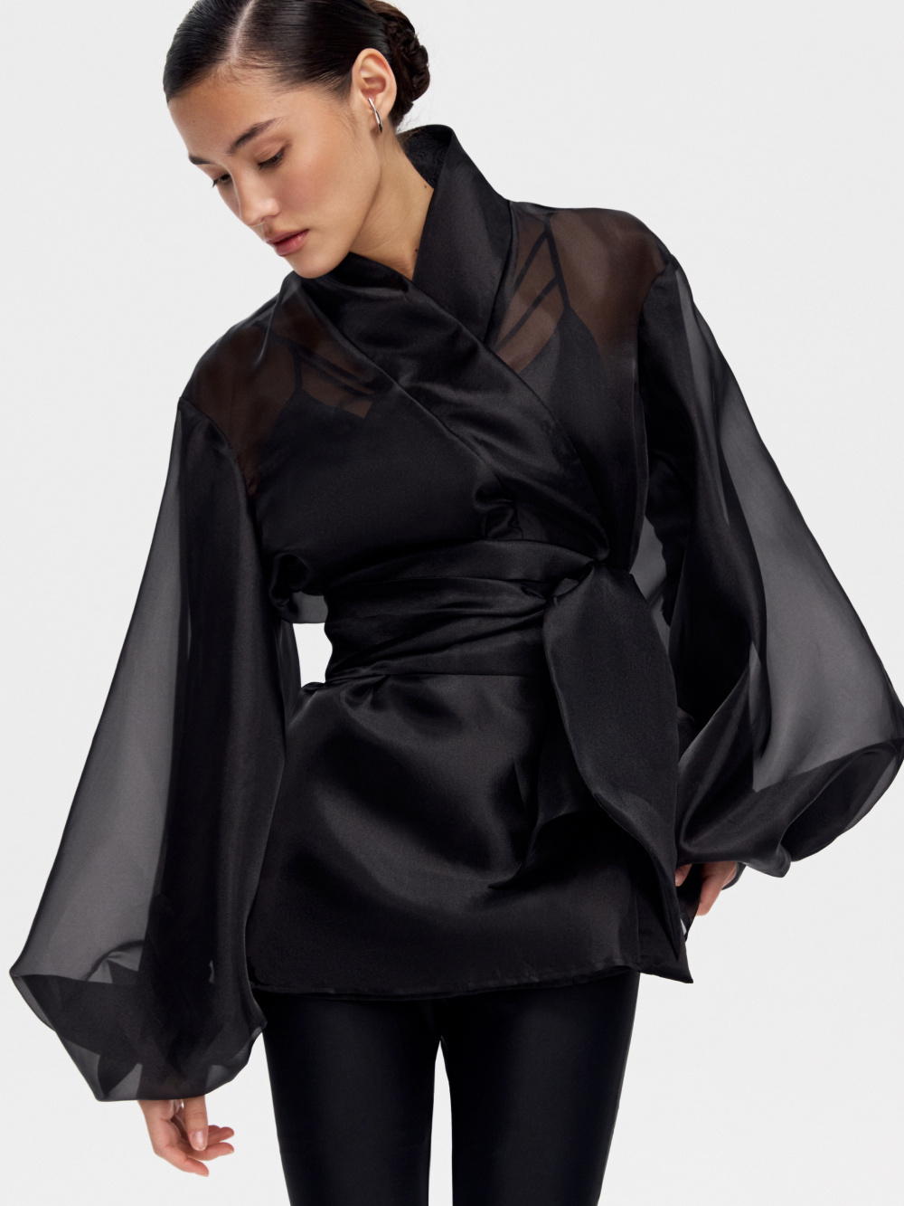 Туника из органзы – знаковая модель и наш бестселлер. Выполнена из матовой органзы, которая великолепна в драпировке и приятна к телу. Выразительные рукава зафиксированы на внутреннюю мягкую сетку и сохраняют форму. Внутренние швы аккуратно закрыты. В комплект входит широкий пояс-лента из основной ткани. Туника идеальна в дуэте с топами в бельевом стиле.