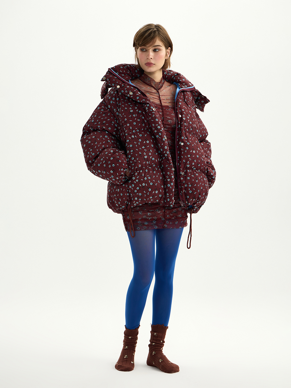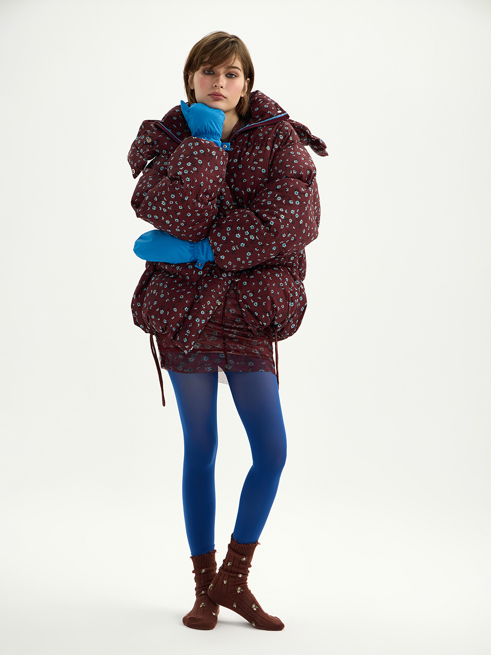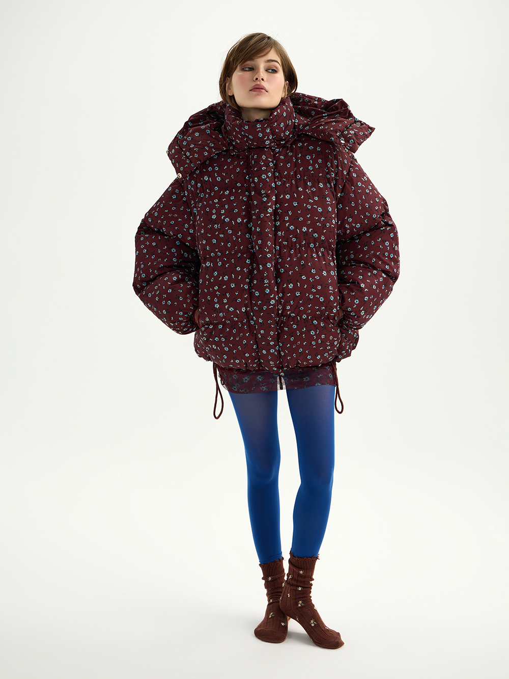 Объёмный пуховик с капюшоном – очень тёплый, лёгкий и комфортный. Актуальная “дутая” форма и принт с основным мотивом коллекции. Дополнительная мембрана – лучшая защита от холодного ветра, а высокий воротник, капюшон и плотная резинка на рукавах не дадут замёрзнуть.