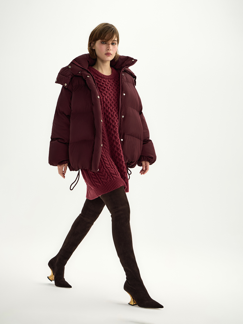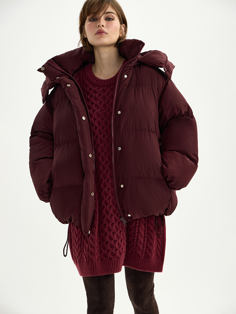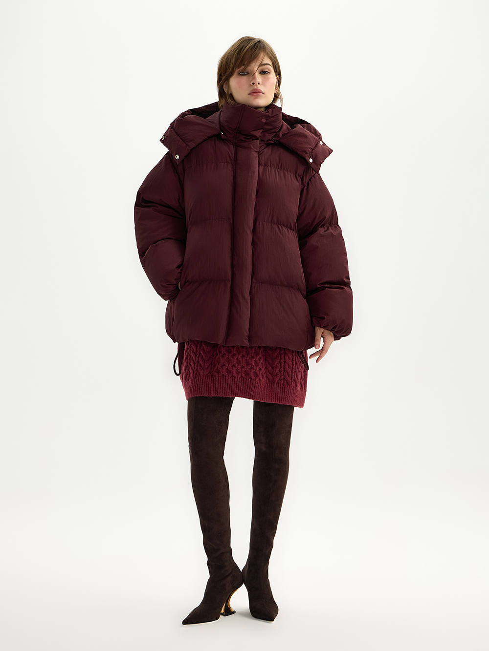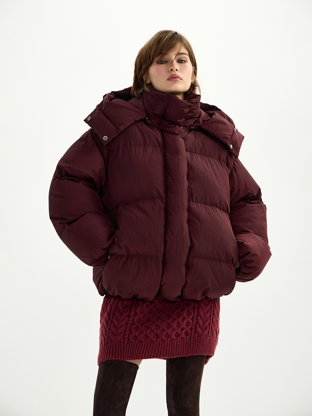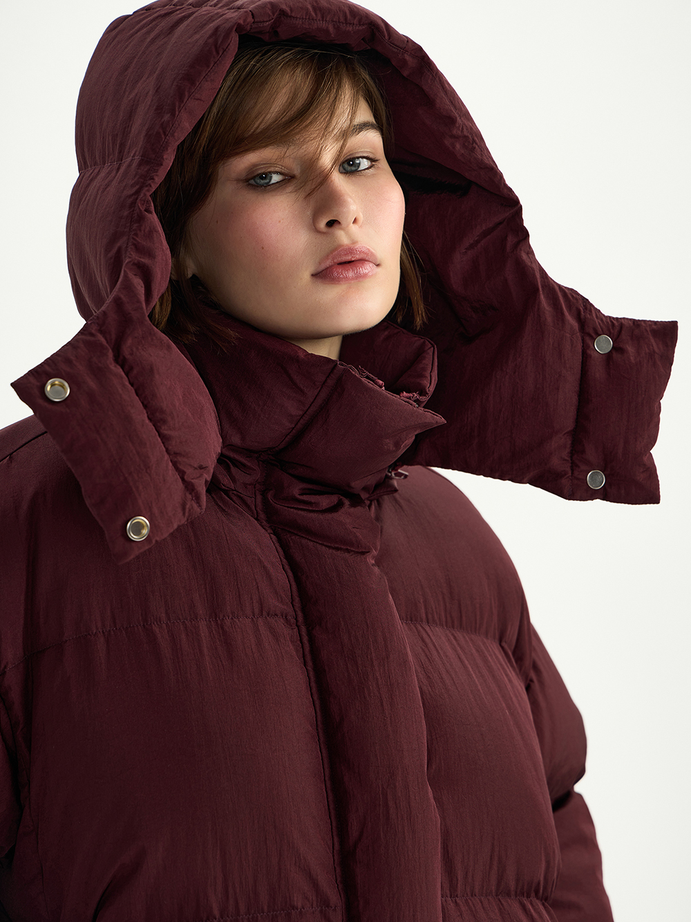 Объёмный пуховик с капюшоном – очень тёплый, лёгкий и комфортный. Актуальная “дутая” форма и верхняя ткань с необычной плотной текстурой. Дополнительная мембрана – лучшая защита от холодного ветра, а высокий воротник, капюшон и плотная резинка на рукавах не дадут замёрзнуть.