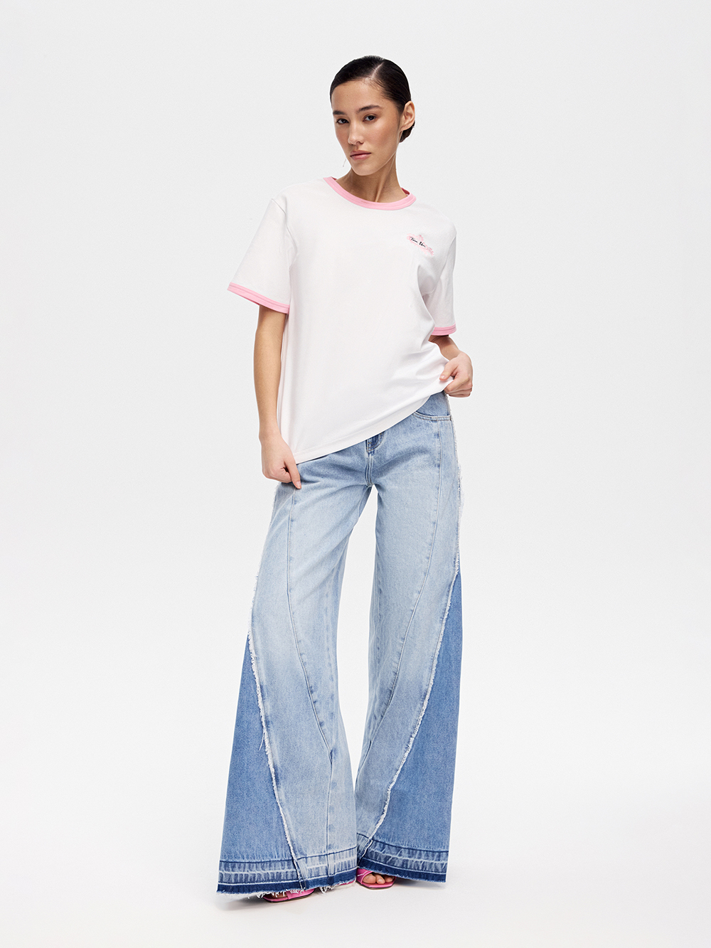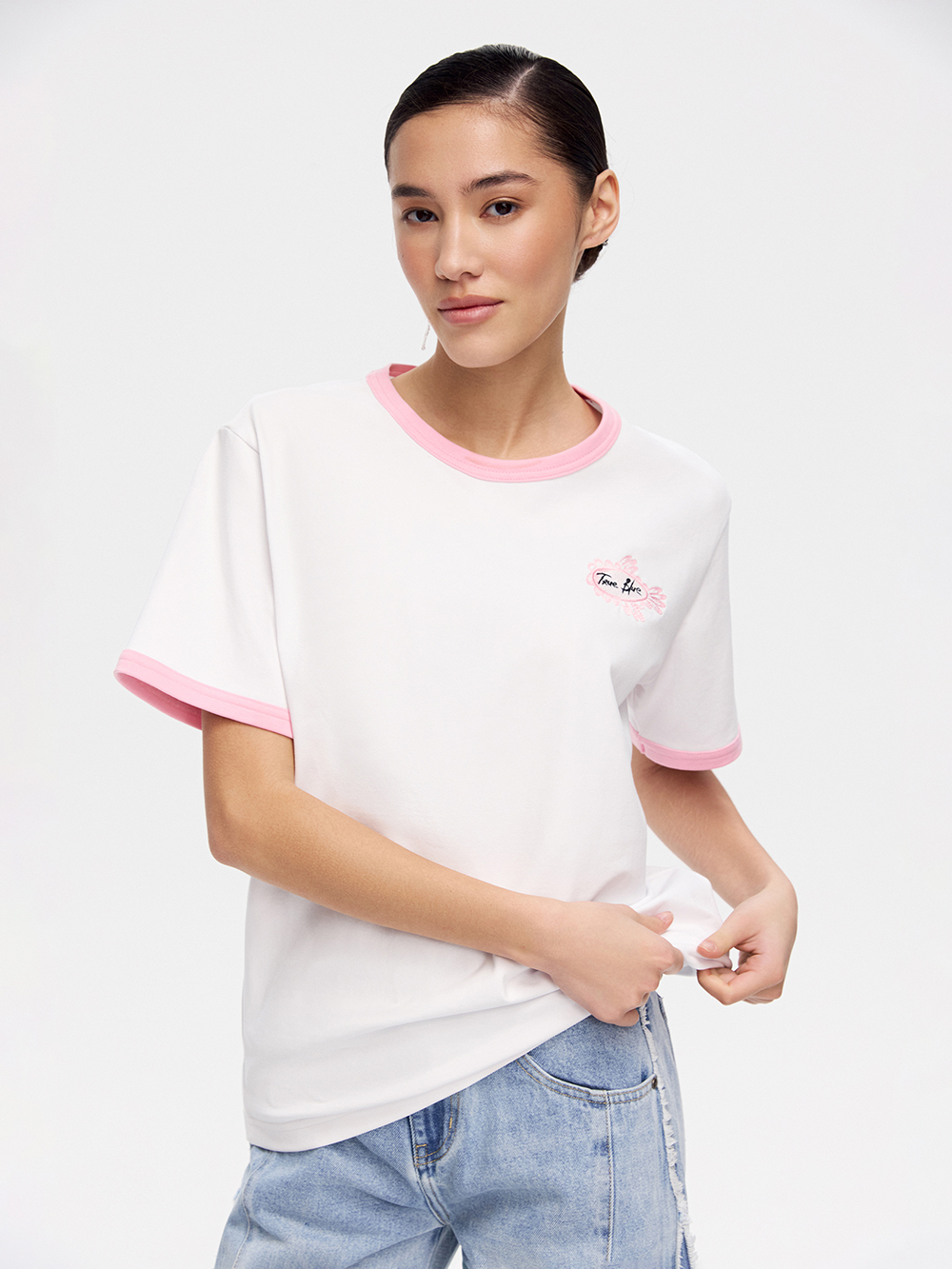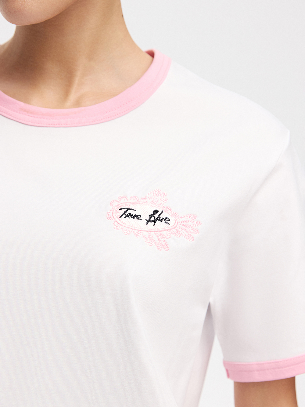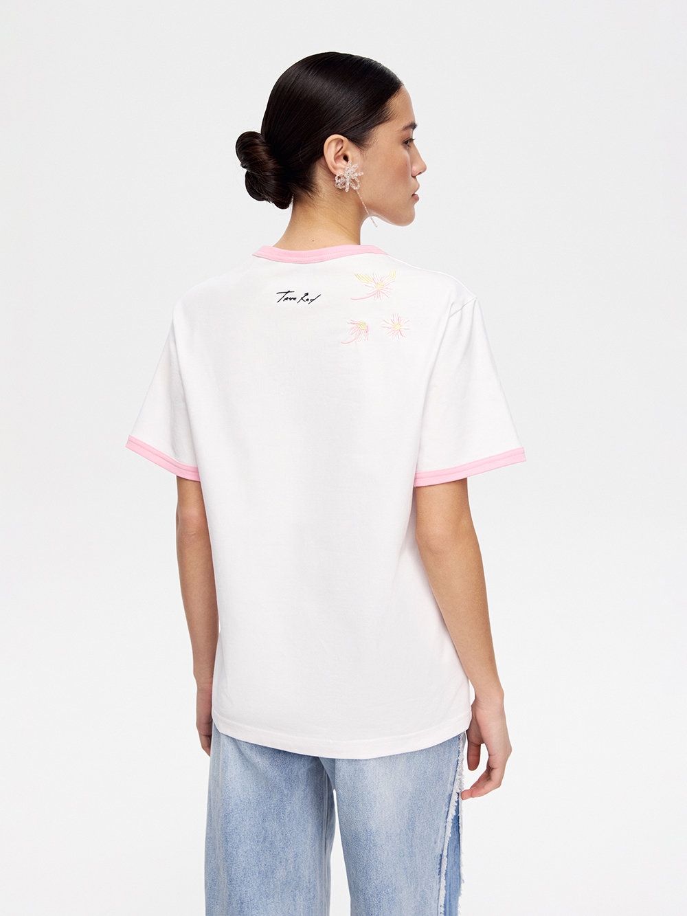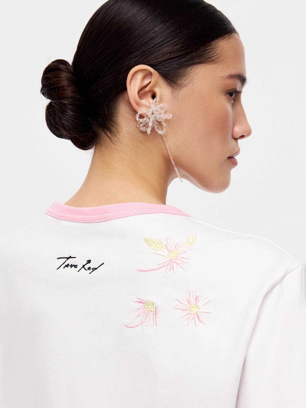Футболка с вышивкой дополнена контрастным кантом – базовая модель превращается в акцентную и небанальную. Вышитые цветы и логотип в авторской стилизации выполнены по рисунку наших дизайнеров.