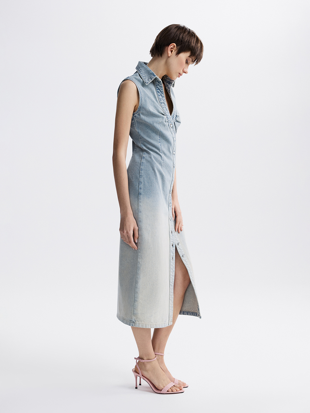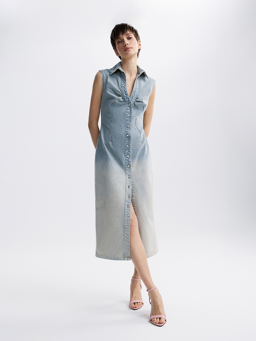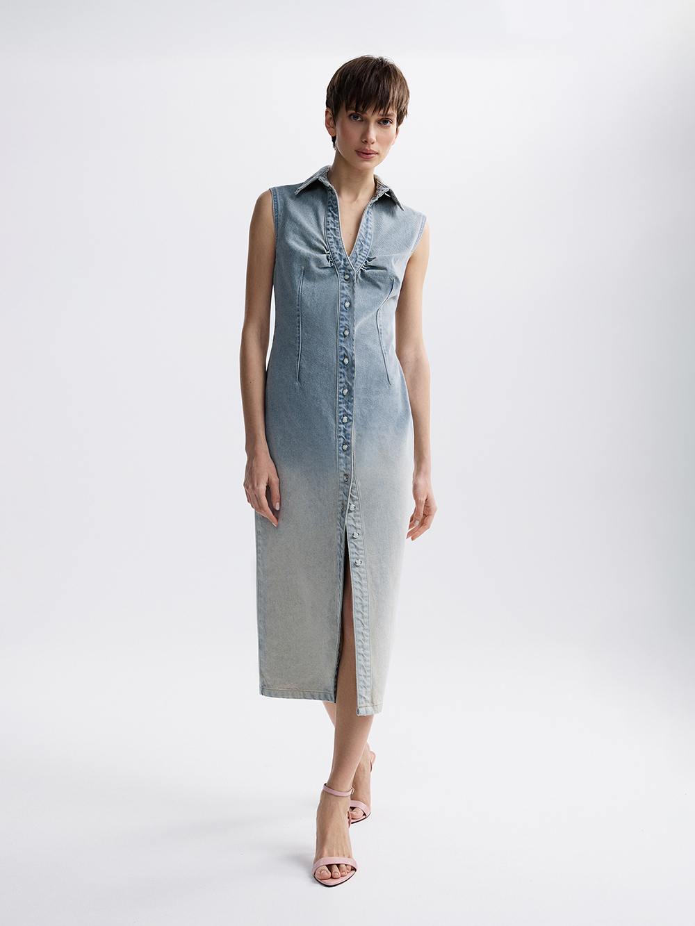 На модели платье размера S