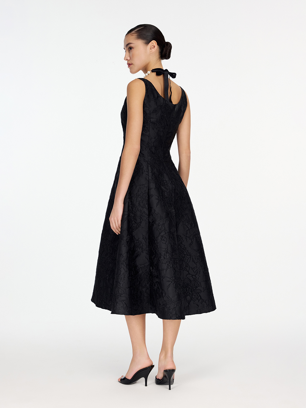 Платье из тафты с фактурным цветочным орнаментом создано для особенных событий. Корсетный лиф с рельефами и пышная юбка подчёркивают талию и формируют женственный силуэт. Декоративная плотная ткань, созданная специально для нарядных изделий, красиво держит форму. Платье дополнено приятной тактильно подкладкой с шёлком в составе. Платье застёгивается на молнию сзади.